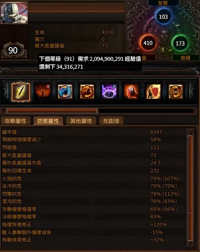 防禦面:血量2544/4378(石化之血),常駐26層護體, 雙格擋68/65 火冰閃混抗79/79/78/76 預期物理傷害減少58% 暴擊傷害減免55%