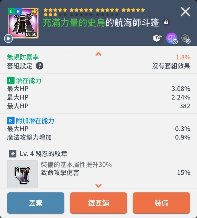 亞一|傑尼斯|23星|航海師斗篷|等級50|綠無視|綠潛HP|暴紋