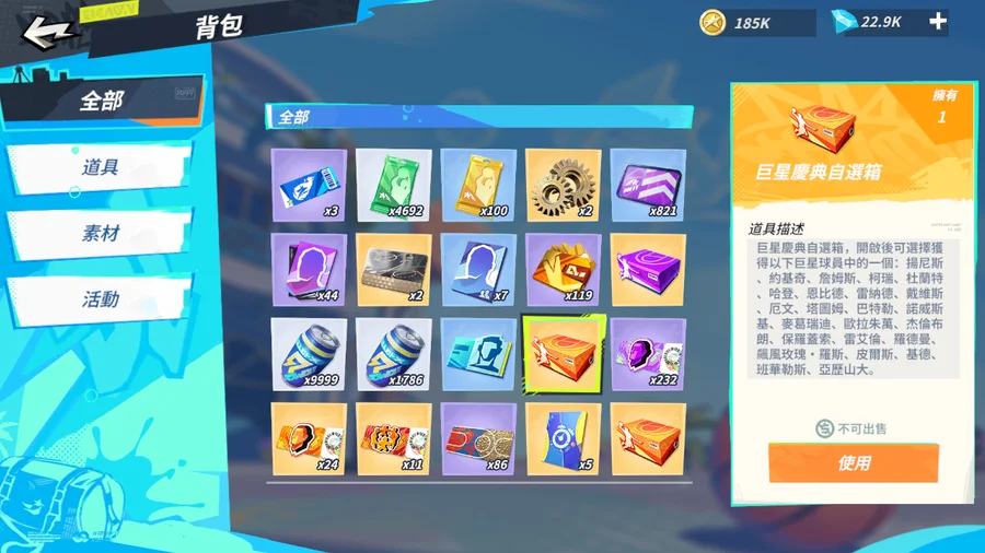 22900鑽 + 群星雲集券*232 + 巨星登場券*24 + 巨星慶典自選箱 + 狂歡節巨星自選箱 + 巨星天賦卡自選包*119 + 改名卡 + 潛能精華3100