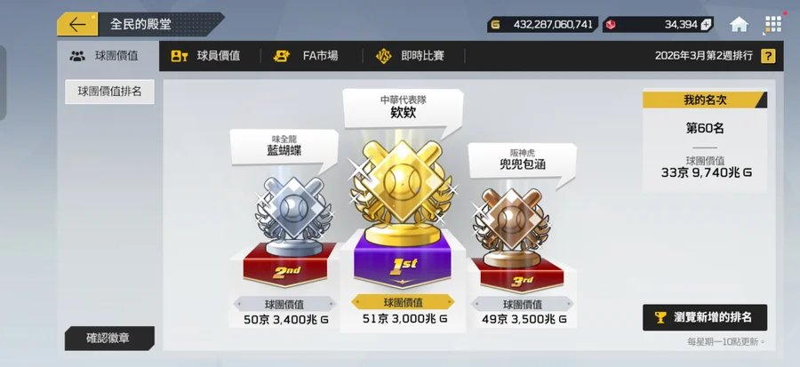 球團價值排行榜第60名