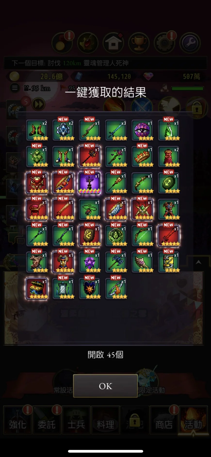 當前商店全禮包+神器必中寶箱組*50+每日補給140天+高級每日補給140天+期間限定禮包(小)*50+期間限定禮包(大)*50+紅寶石500萬+藍鑽石300萬=1500