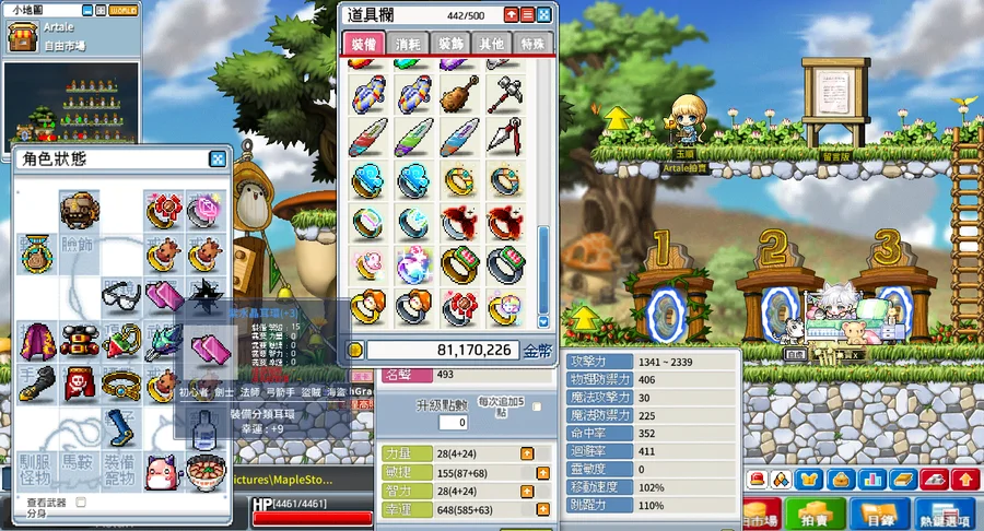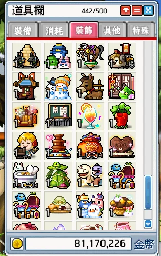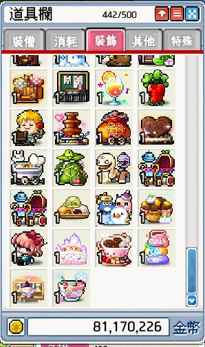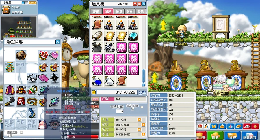 背包資源:500格、楓幣3400w、雪花106個、