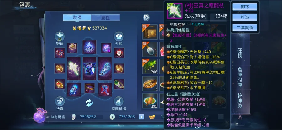 靈核100級,宗派技能27級,裝備評分53~54w