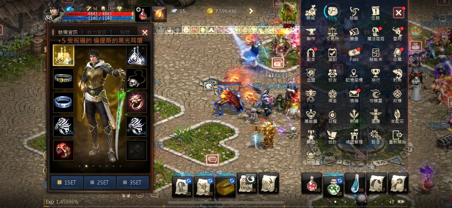 +5祝黑耳、+4祝藍耳、+4祝防戒*2(攻速+10%)、亡者手環、守護戒指、騎士團戒、勇敢皮帶、骷髏項鍊、+3力量符石、+4祝福守護印章、+4祝福回復印章