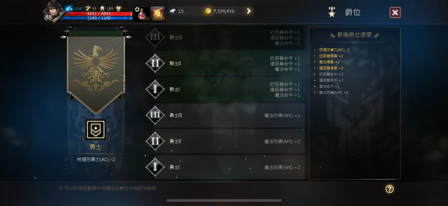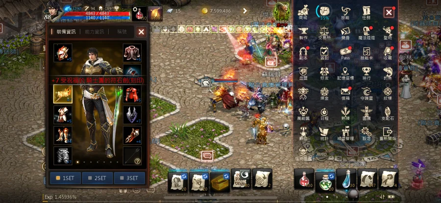 +7祝福騎士團符石劍(紅武)、+5祝福騎士團頭盔、+5祝福騎士團盔甲、+4祝福騎士團長靴、+4騎士團手套、+5祝福騎士團批風(紅裝)、+6祝福武官之盾、+7鐵門褲子、+6光之力量肩甲、+6光之力量內衣、+9水晶短劍(藍武)