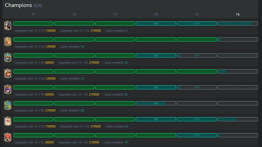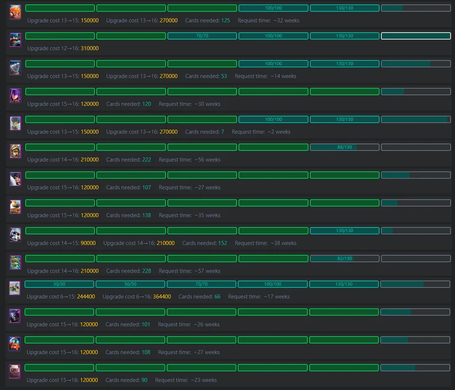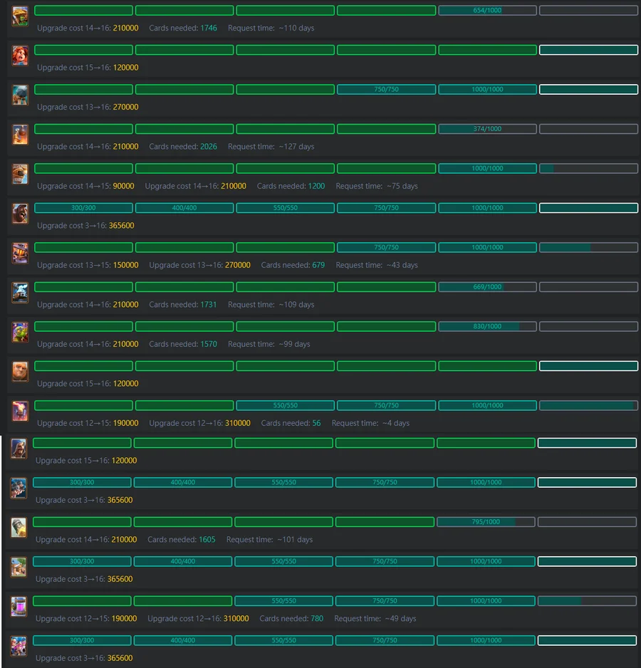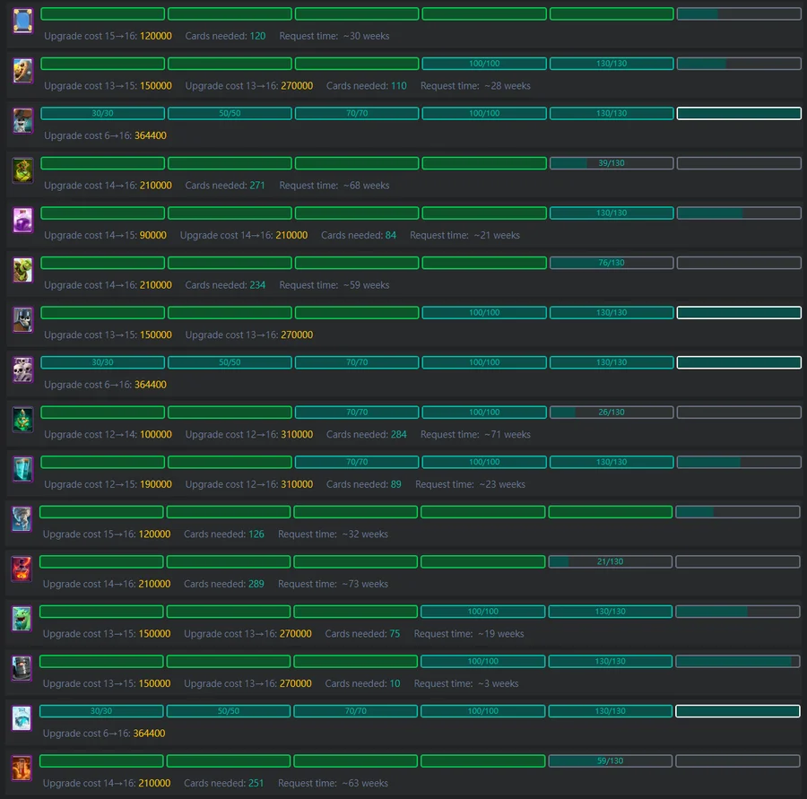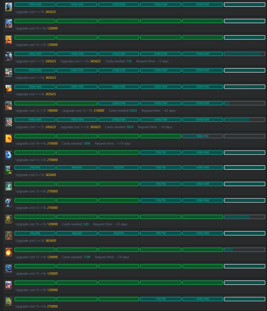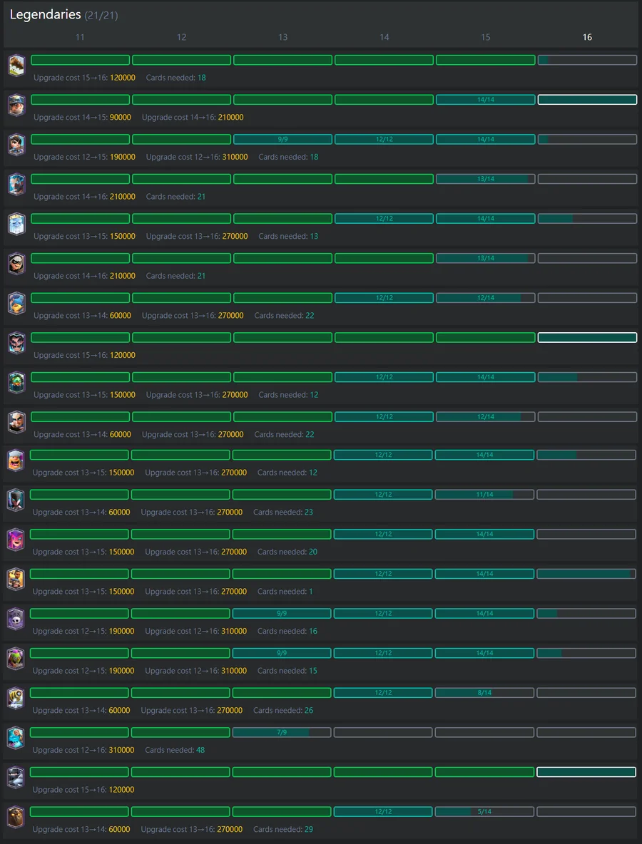 15等國王塔,卡片近乎都滿15等,些許16等,請參考圖片