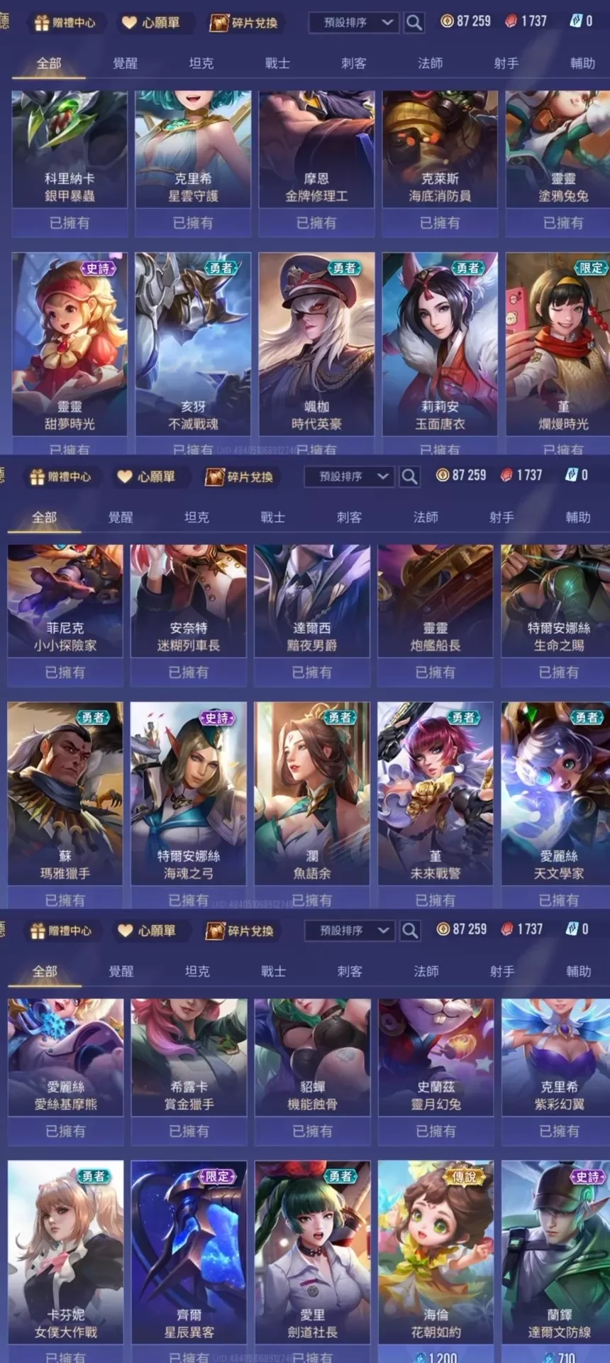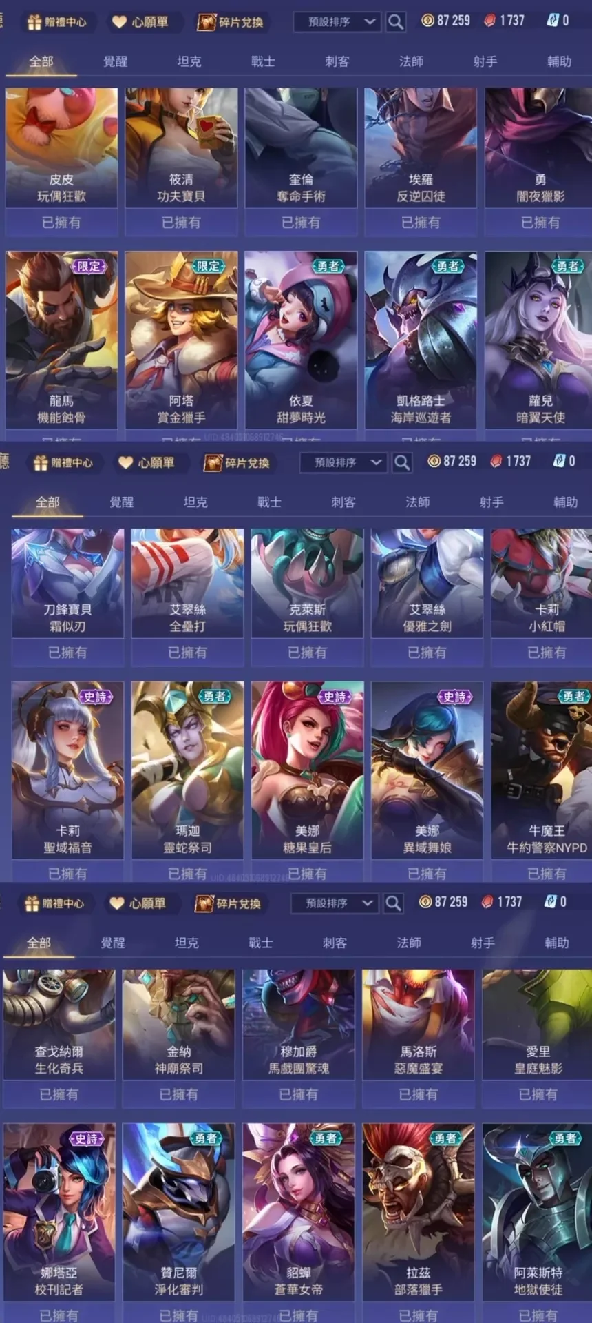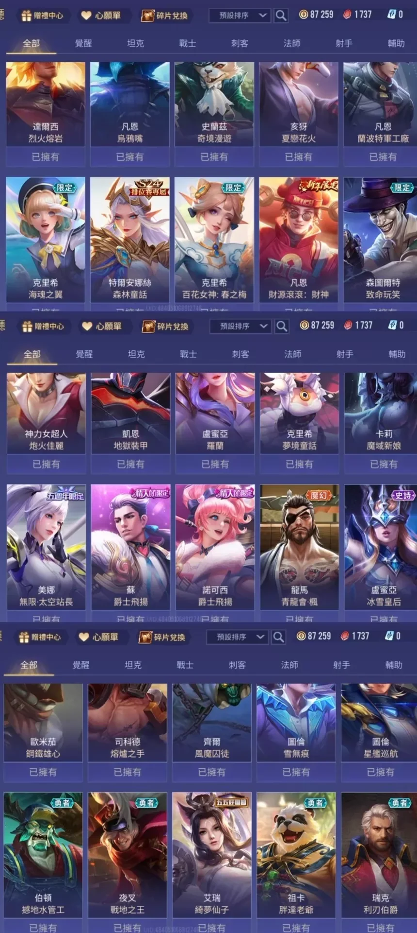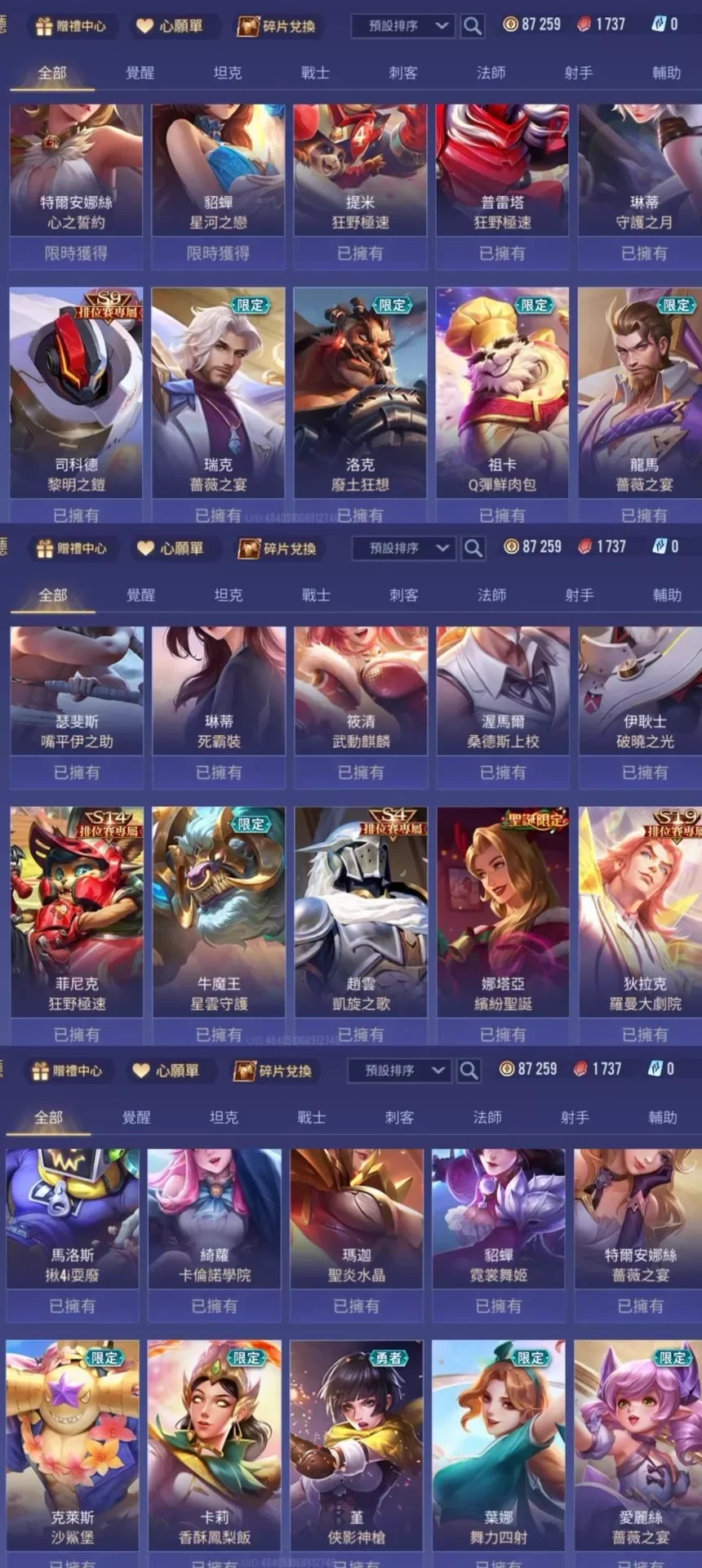 傳說對決台服帳 54英雄116造型 8.7萬金幣 1213英雄碎片 蘇爵士飛揚 娜塔亞繽紛聖誕 等 奧義90 garena登入 安卓蘋果都可以