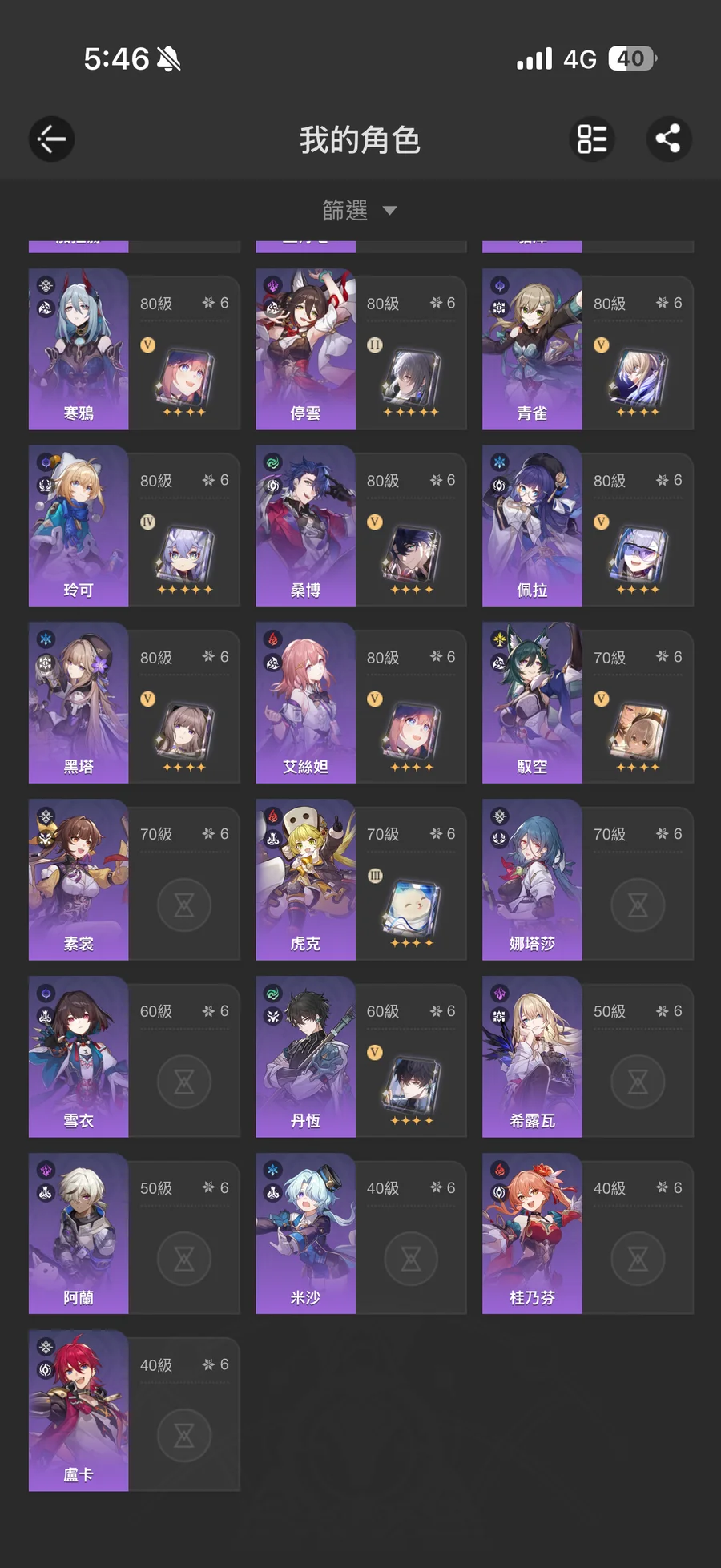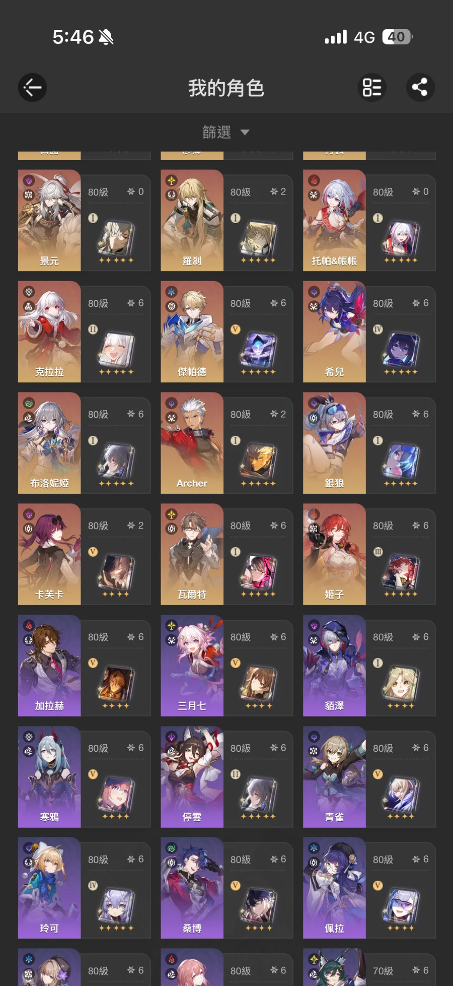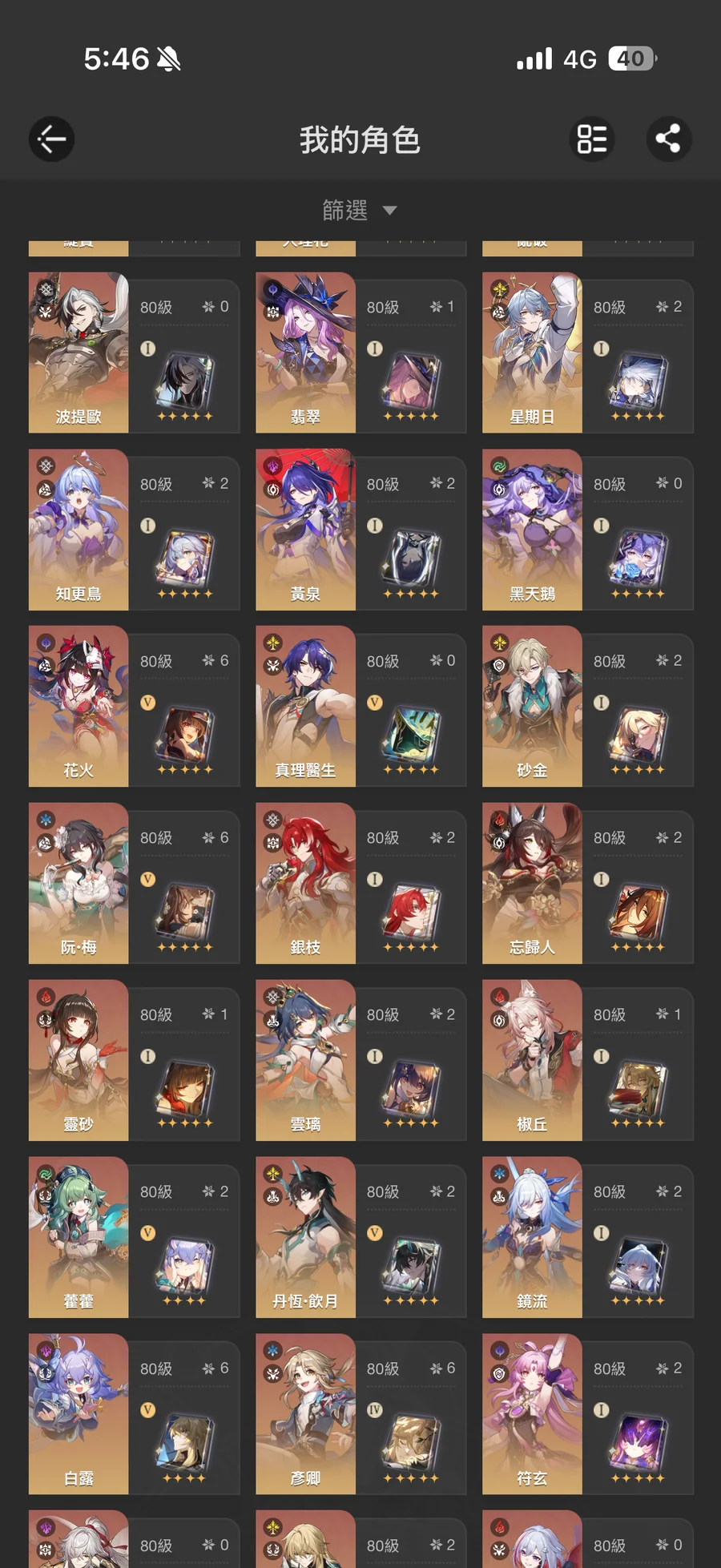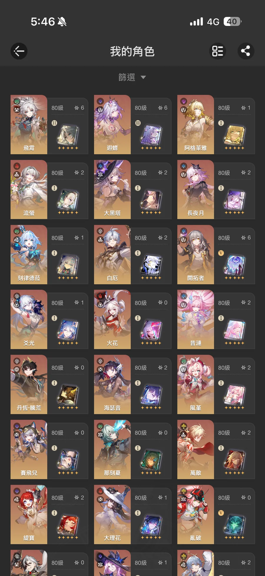 流螢 大黑塔 長夜月 白厄 昔濂 海瑟音 風堇 萬敵 緹寶 星期日 知更鳥 黃泉 砂金 銀枝 忘歸人 雲璃 霍霍 飲月 鏡流 符玄 羅剎 Archer 卡芙卡