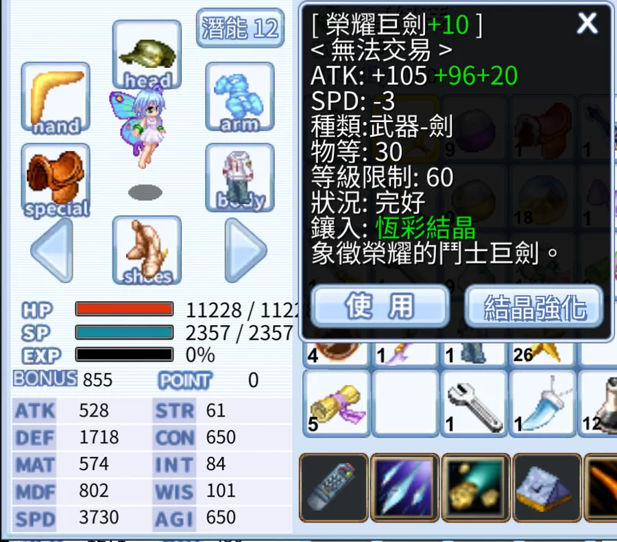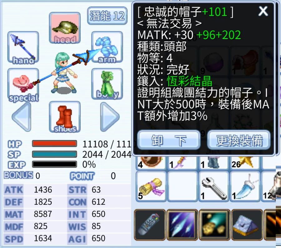 紅藍貓手/ATK+MATK長槍/騎士專武/30matk組織帽x2 /黑羽弓/戰鷹/血色鐮