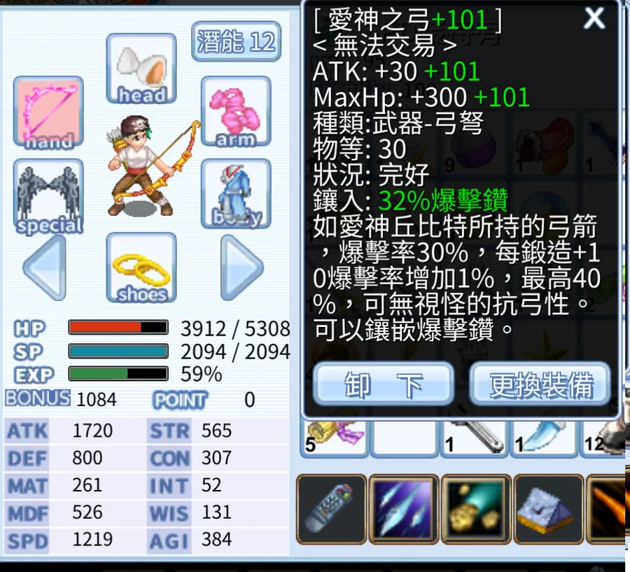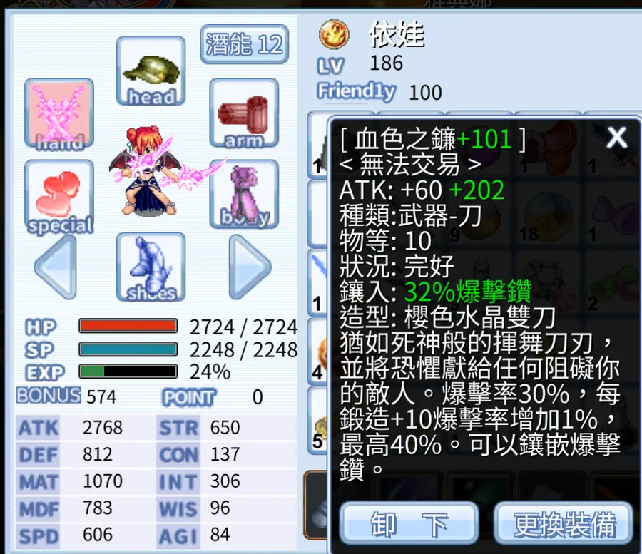紅藍貓手/ATK+MATK長槍/騎士專武/30matk組織帽x2 /黑羽弓/戰鷹/血色鐮
