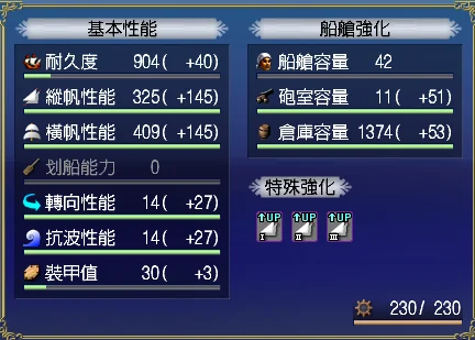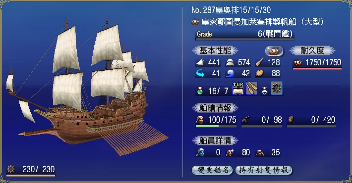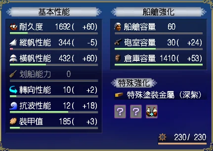 【強化性能】双帆、抗波、轉向、裝甲滿,倉庫差7滿(需要可補滿)