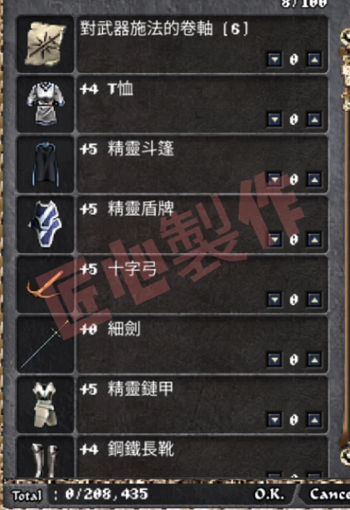 猛將套餐 +6細劍 +6紅頭+6精鏈+4保斗+4鋼手+4內衣+4鋼靴+6精盾=20,600t (裝備價值230萬)