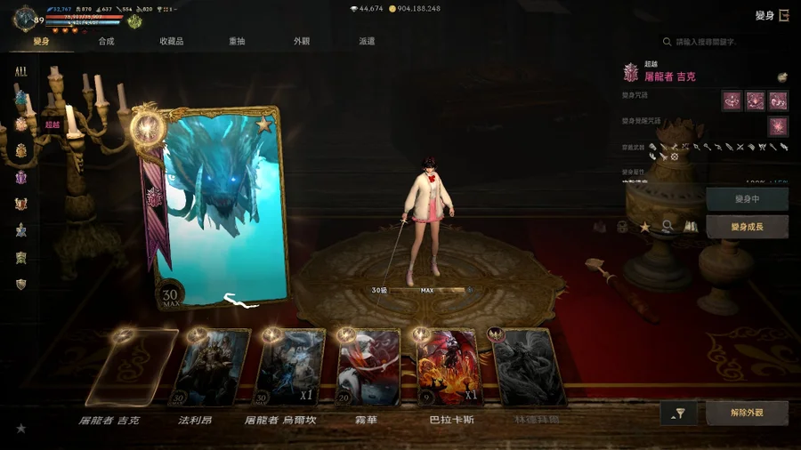 天堂W : 89.46%、15粉、20金、最高攻命552/800 防850、減傷388、抗暈237%、1金滿紫技、火/水眼滿分、8刻印紫裝、收藏57.74%、3紫加護、+6巨神符石、深淵杜賓狗、鬼劍 EP.904
