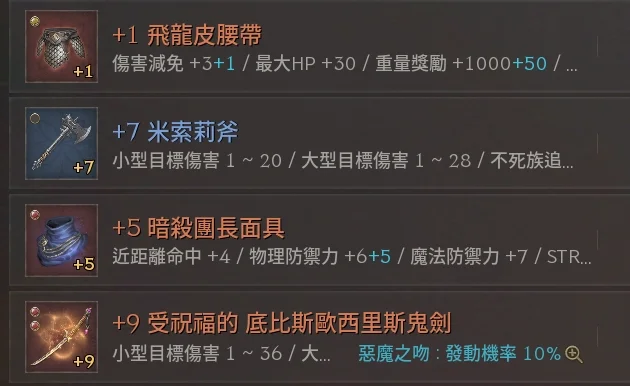【持有其他裝備】:+5克特手套(刻印)、+1飛龍皮腰帶(出售中)、+5暗殺團長面具(出售中)、+9受祝福的底比斯歐西里斯鬼劍(出售中)、+0知識脛甲(出售中)