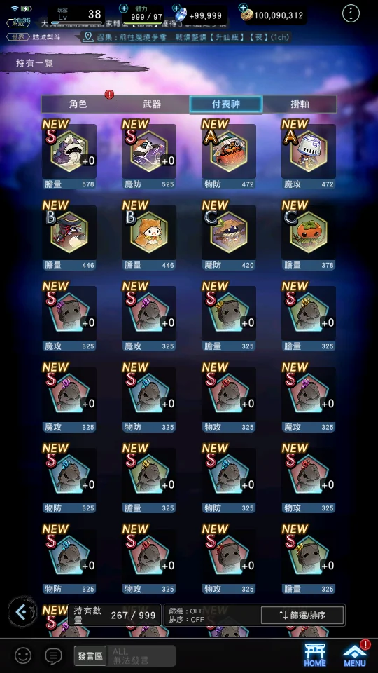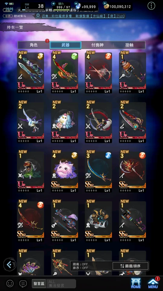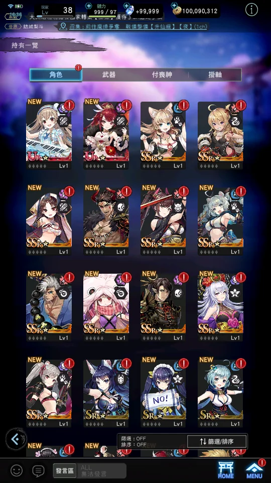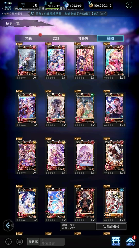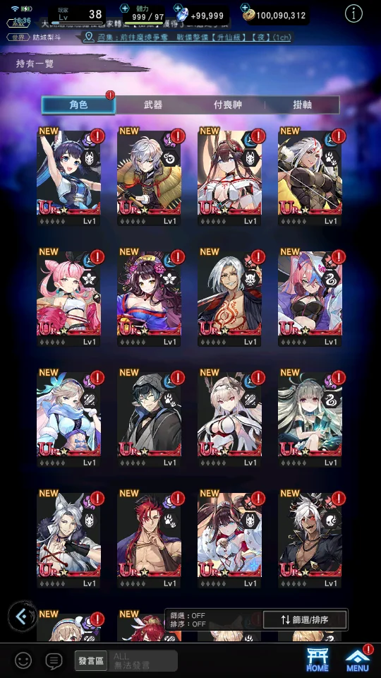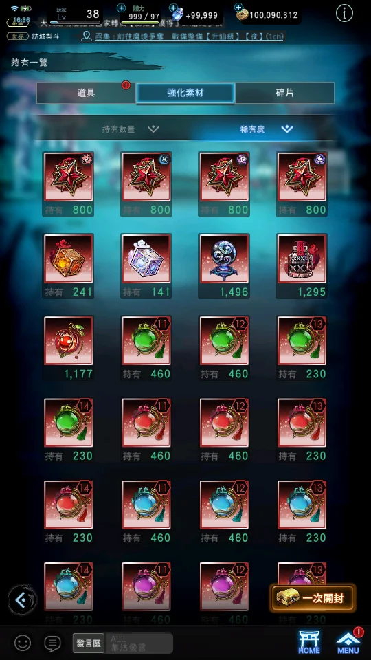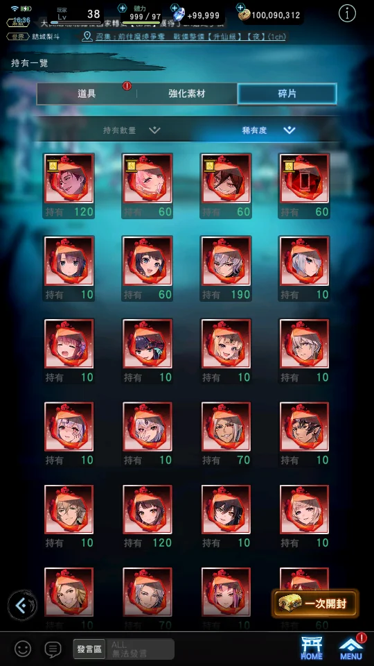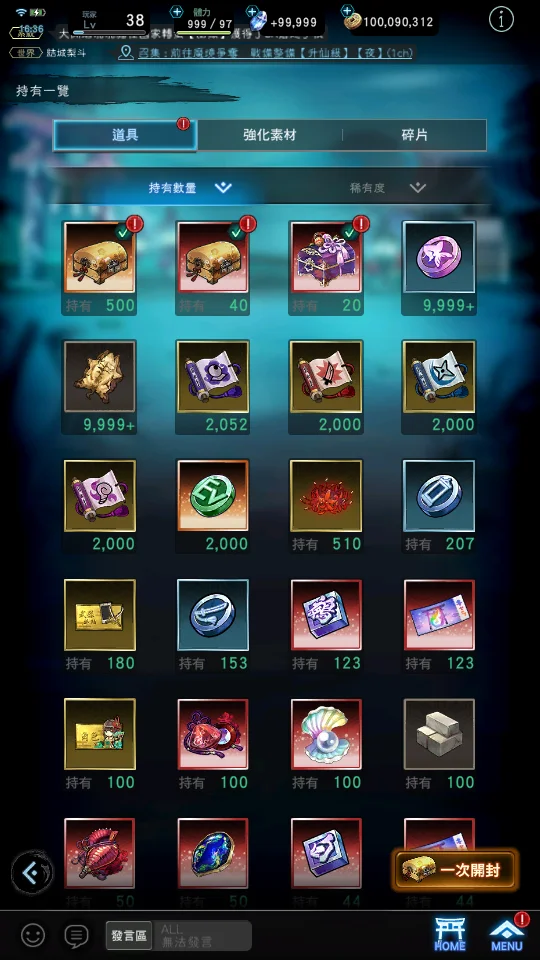【道具】武器掛軸單抽轉蛋券X180、角色單抽轉蛋券X100、125746鑽,800T