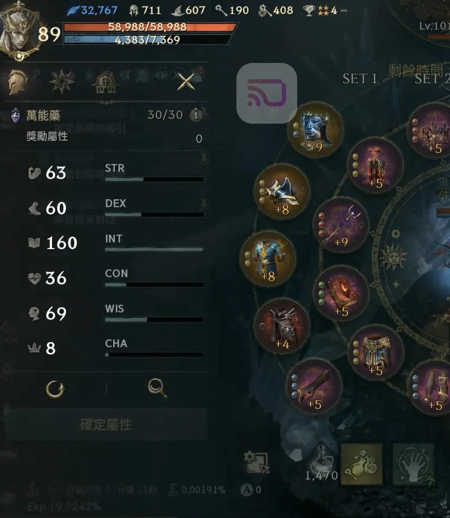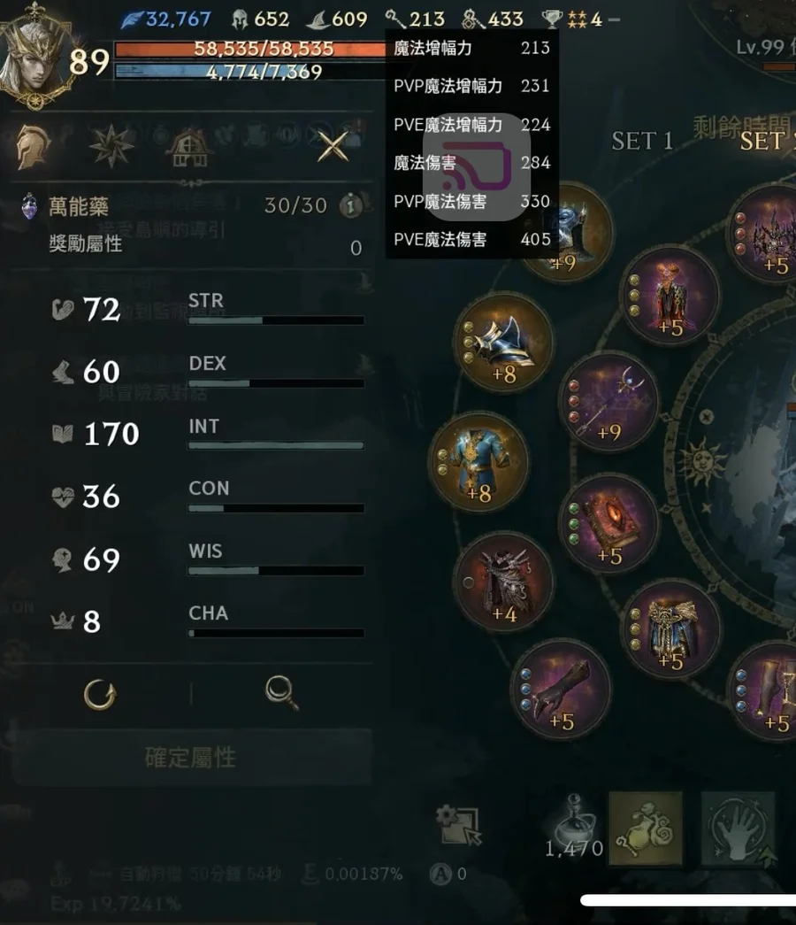 【素質1全攻擊配置】:血量58,602、魔傷命284/433、魔增203、防/魔防655/600、減傷/PVP減傷285/79、暈命/抗暈14/186%