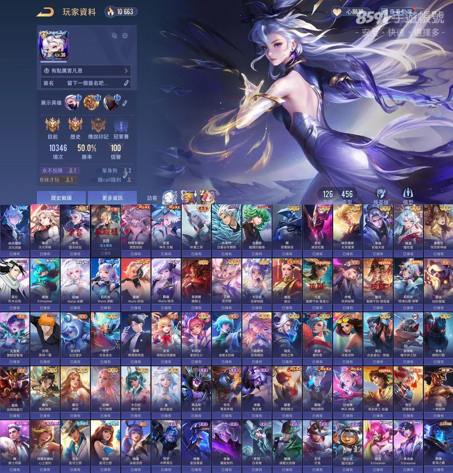 雙次元突破!歷史璀璨傳說印記!全英雄四百多造型!共126英雄456造型!勝率50%!!共12次S戰場傳說印記!!常用奧義皆已齊全!!多課金抽獎造型!