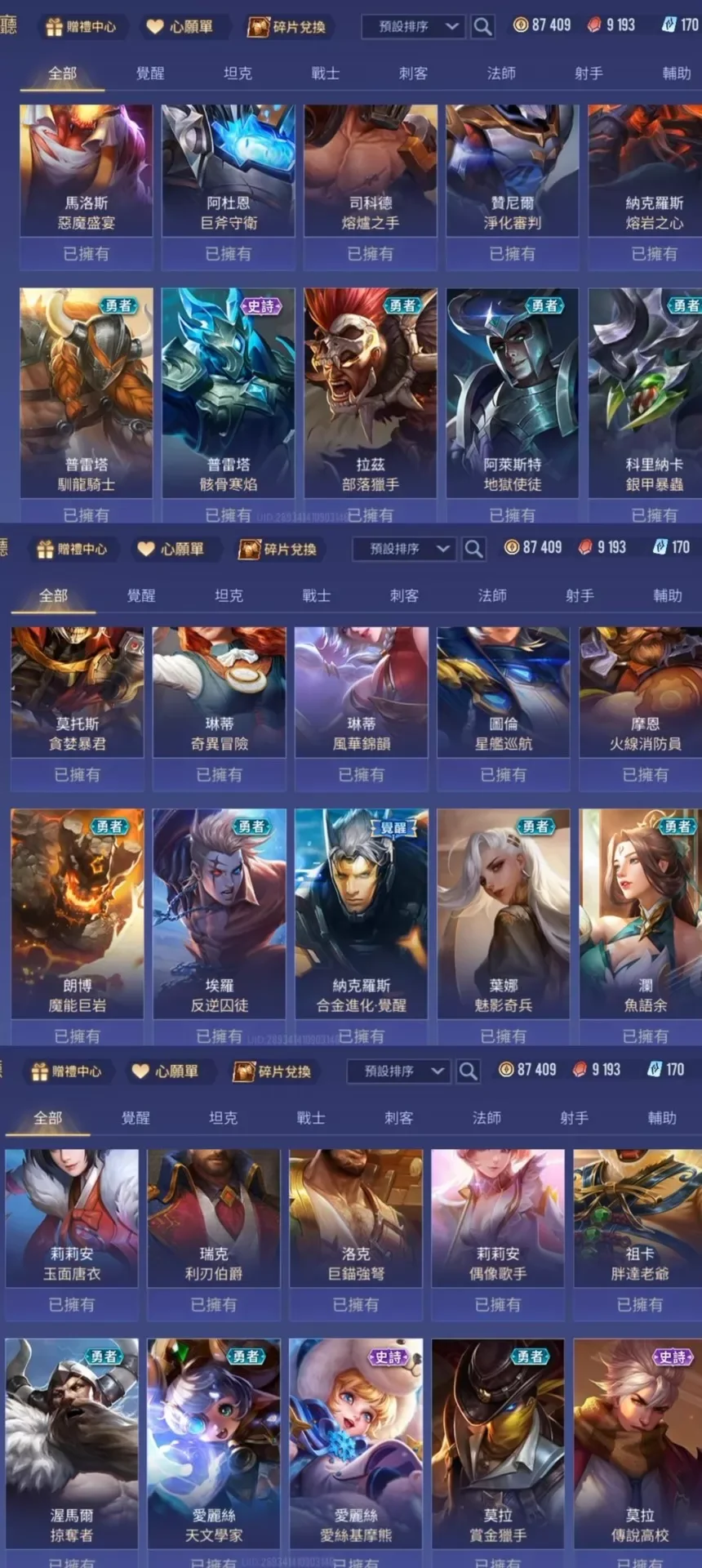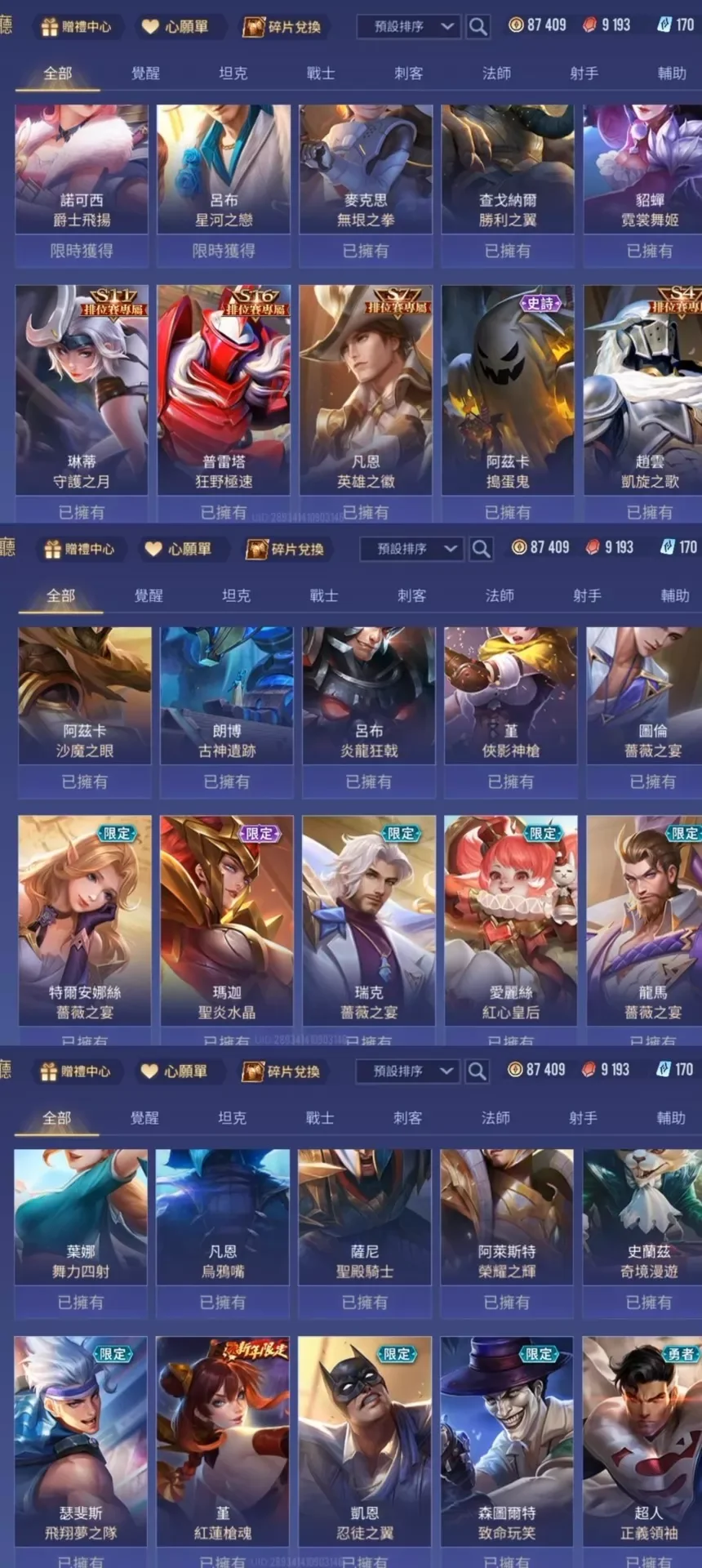 傳說對決台服帳 65英雄92造型 8.7萬金幣 可改名 無綁定可換綁改密 奧義90 garena登入 安卓蘋果都可以