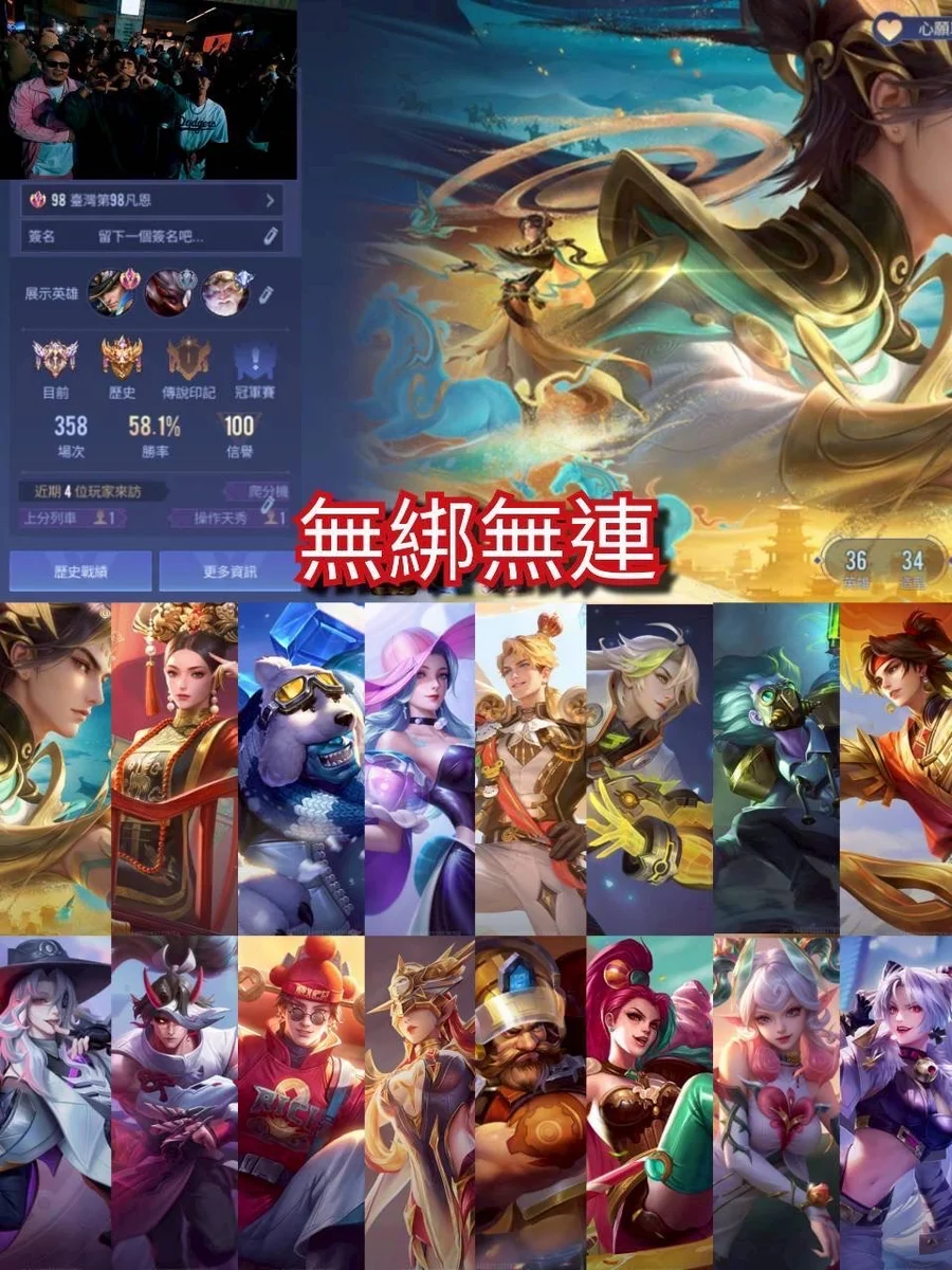 【Garena帳無綁無連、戰場傳說、V4、36英、34造】無無歷史戰場 凡恩新年 聖誕 喜妃 窺海 布丁狗 終焉 新年