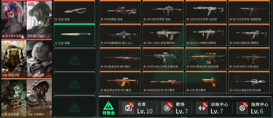 【特勤处】制药台Lv.3/工作台Lv.3/仓库Lv.10/防具台Lv.3/训练中心Lv.7/靶场Lv.7/技术中心Lv.3/指挥中心Lv.6/潜水中心Lv.2/收藏室Lv.1