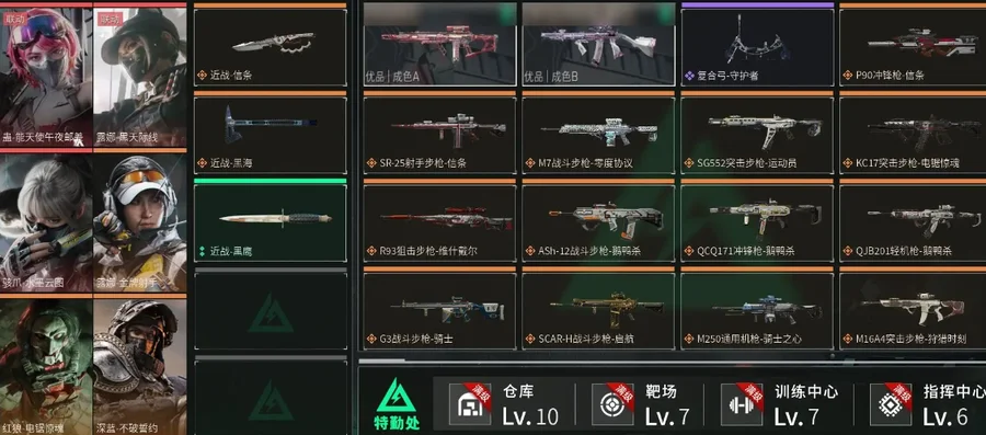 【特勤处】制药台Lv.3/工作台Lv.3/仓库Lv.10/防具台Lv.3/训练中心Lv.7/靶场Lv.7/技术中心Lv.3/指挥中心Lv.6/潜水中心Lv.3/收藏室Lv.2