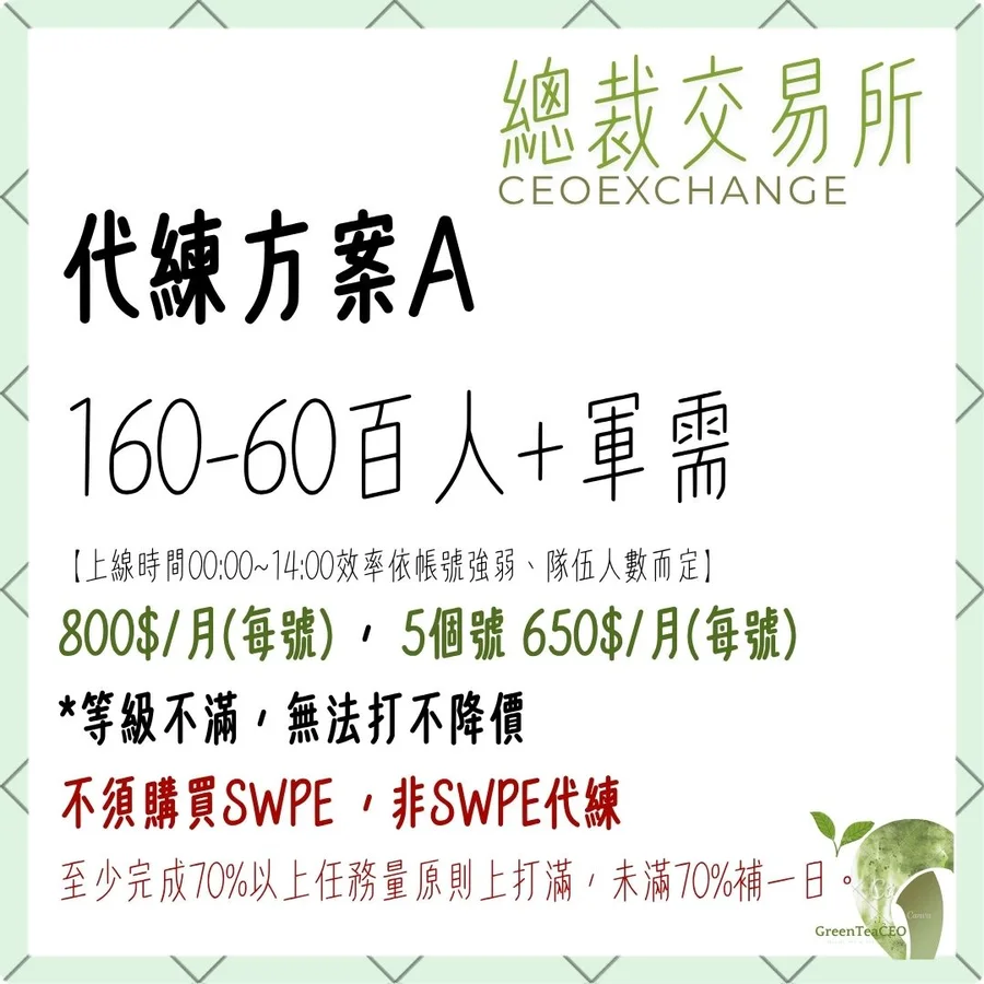 【總裁交易所】代練|純掛機|60-160百人軍需|非SWPE免自備|帳號安全
