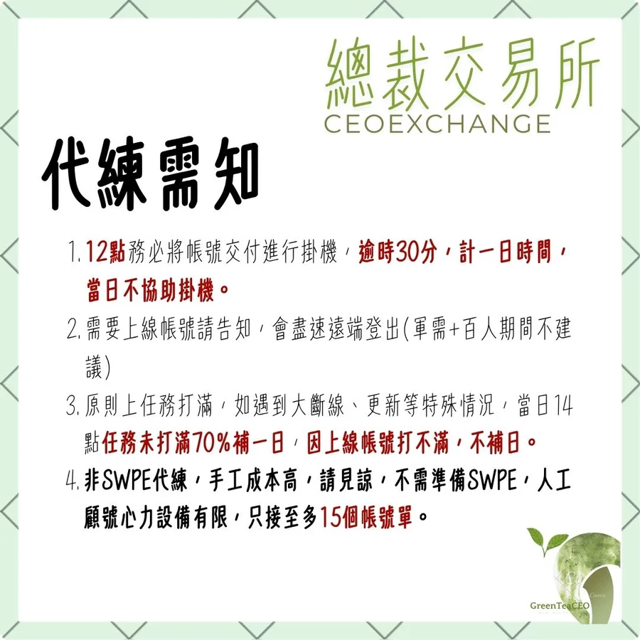 4.非SWPE代練,手工持本高,請見諒,不需準備SWPE,人工顧號精力有限,至多接15帳號單