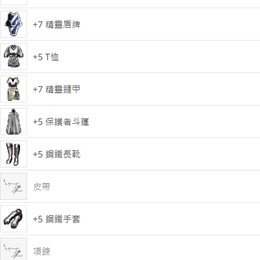 +5鋼手/+5鋼靴/+5保斗/+5內衣/+7精鏈/+7精盾/+6紅頭/守護戒指x2