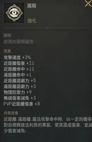【魔眼】:水20(攻速3,近傷21,近命11,近回5,遠回3,無視傷害減免3,物防9,PVP進傷8)