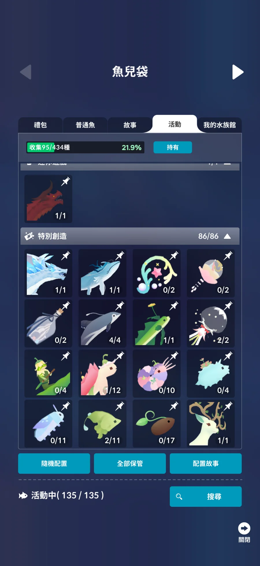 銀河龍 銀河鯨魚 銀河海星 火龍 冰龍 鬼怪 冰霜幼龍 雅特蘭提斯精靈鯨魚 神秘旗魚很多隻 森林守護者及各種禮包魚和各種特別創造魚