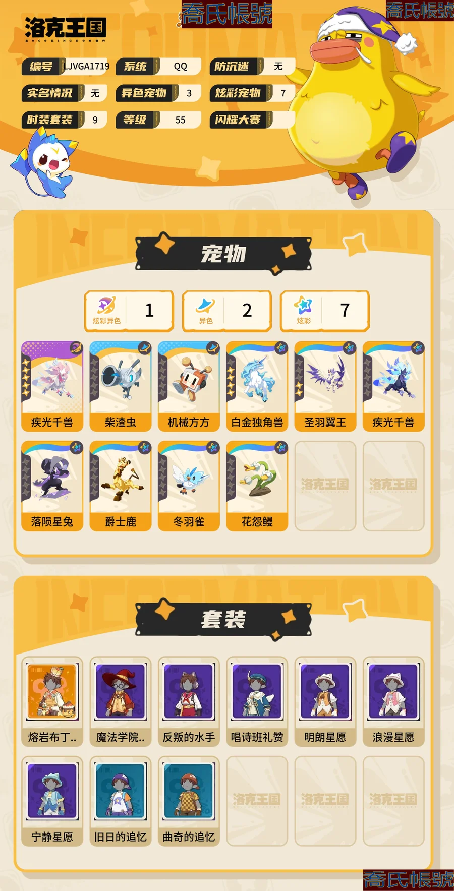【OBLJVGA171942】男女主:男主,異色寵物數量:3,炫彩寵物數量:7,國王球:33,稜鏡球:10,織夢稜鏡球:1,許願星:355,洛克鑽:60,異色寵物:疾光千獸(異色炫彩),柴渣蟲(異色),機械方方(異色),炫彩:白金獨角獸(炫彩),聖羽翼王(炫彩),疾光千獸(炫彩),落隕星兔(炫彩),爵士鹿(炫彩),冬羽雀(炫彩),花怨鰻(炫彩),時裝套裝:熔岩布丁印象;詳情看圖【安卓QQ】【可二次實名】【無防沉迷】【官方截圖】老玩家