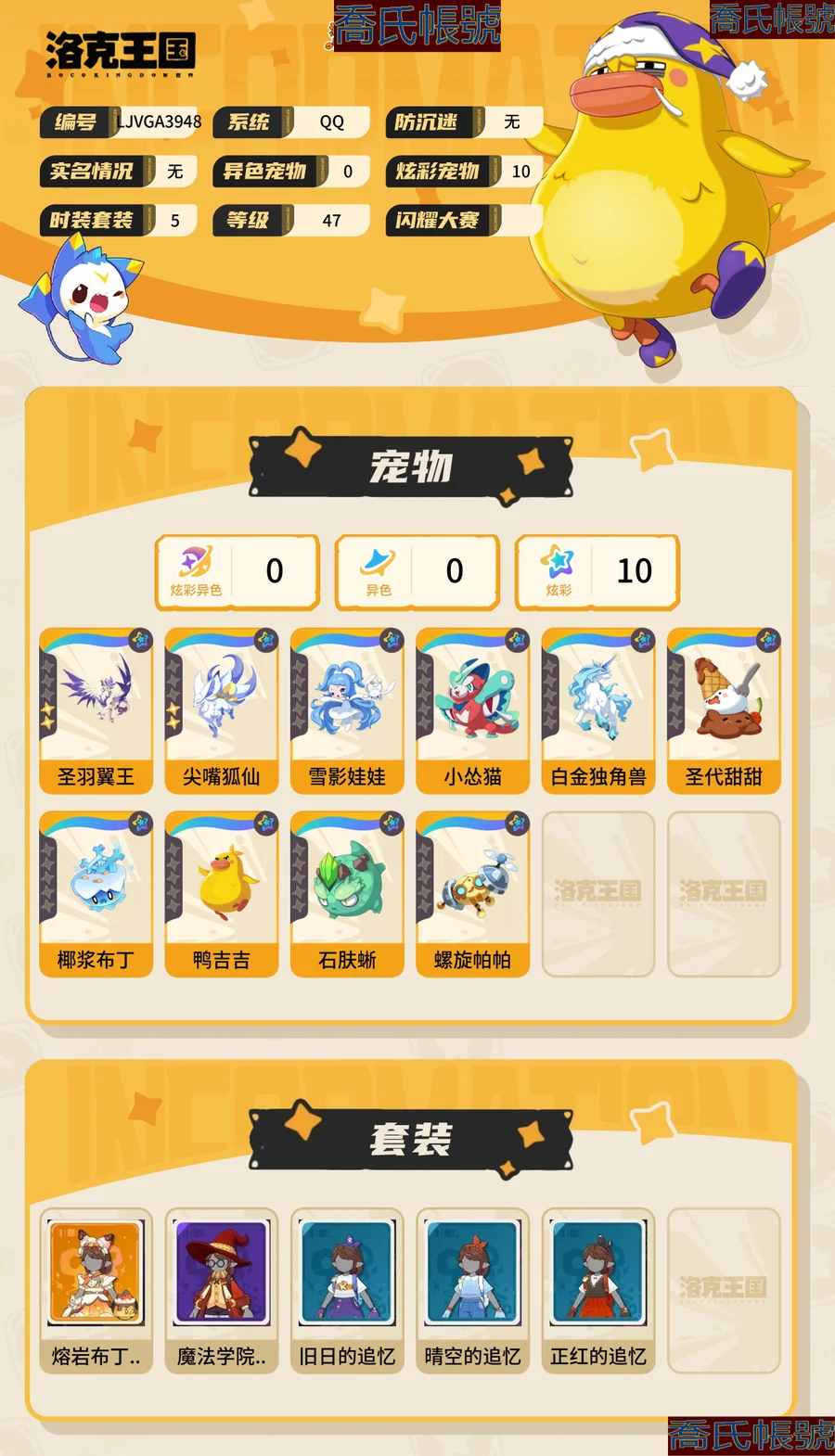 【OBLJVGA394842】男女主:女主,炫彩寵物數量:10,國王球:23,稜鏡球:2,許願星:288,炫彩:聖羽翼王(炫彩),尖嘴狐仙(炫彩),雪影娃娃(炫彩),小慫貓(炫彩),白金獨角獸(炫彩),聖代甜甜(炫彩),椰漿布丁(炫彩),鴨吉吉(炫彩),石膚蜥(炫彩),螺旋帕帕(炫彩),時裝套裝:熔岩布丁印象;詳情看圖【安卓QQ】【可二次實名】【無防沉迷】【官方截圖】寫錯了不出qq