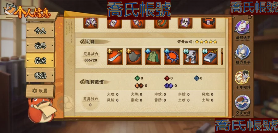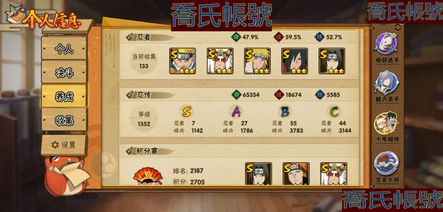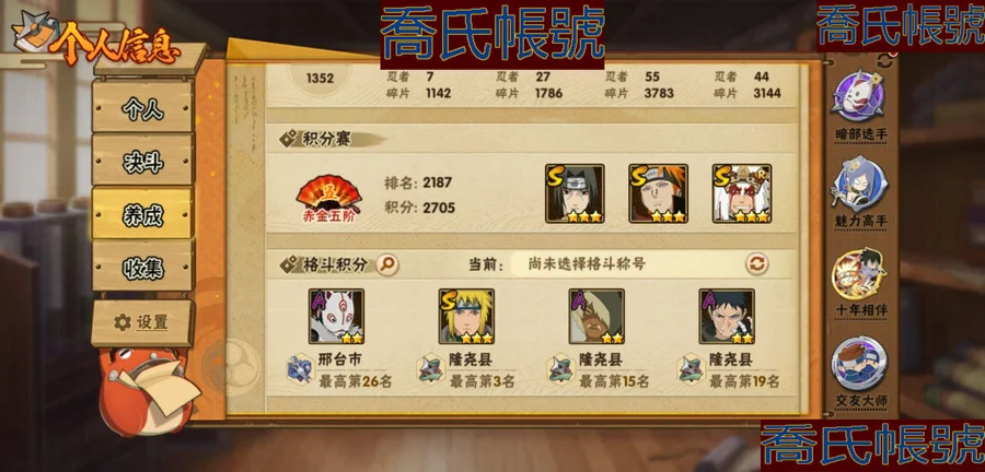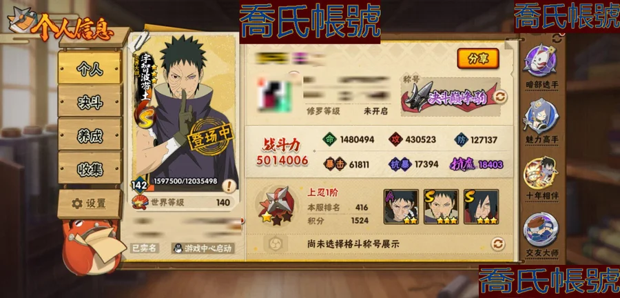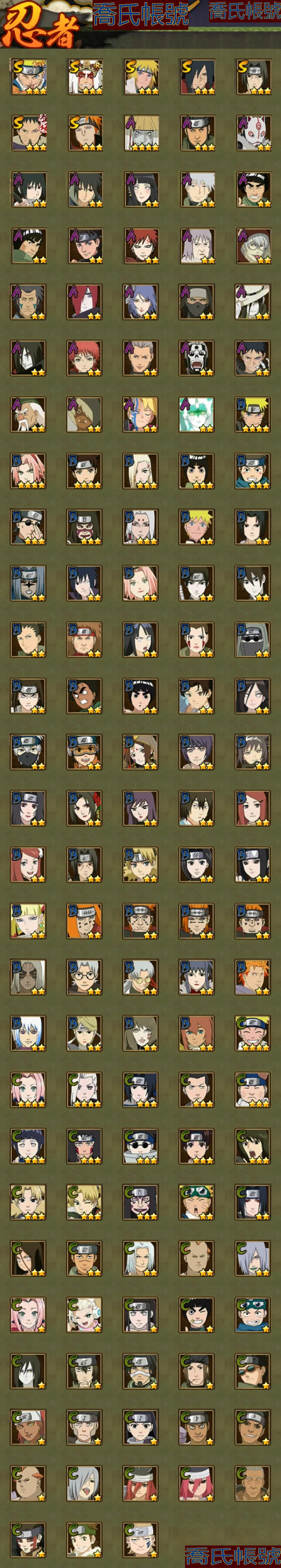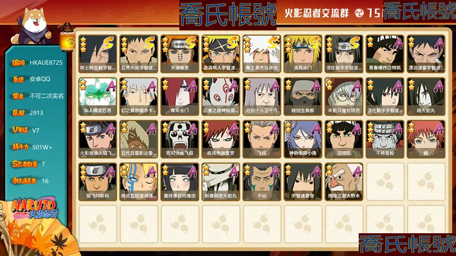 【OBHKAUE872542】S忍7個;A忍27個;時裝12個;通靈獸16個;秘卷31個;戰鬥力:501W+;主場景0個;段位:上忍1階;本服排名:2045;戰區排名:未上榜;VIP7級;S忍:穢土轉生解宇智波斑,忍界大戰宇智波帶土,天道佩恩,漩渦鳴人宇智波佐助,舞之豪傑自來也,波風水門,須佐能乎宇智波鼬;A忍:青春爆炸邁特凱,漂泊浪客宇智波帶土,仙人模式巳月,幻之真容旗木卡卡西,青年長門,忍者之路神秘面具男,近松十人衛千代,曉創生角都,半蛇斗篷藥師兜,須佐能乎宇智波佐助,曉大蛇丸,火影繼承人猿飛日斬,五代目雷影達魯伊,死司憑血飛段,疾風傳我愛羅,飛段,神駒佑將小南,邁特凱,幹柿鬼鮫(4星),蠍,猿飛阿斯瑪(3星),桃式顯現漩渦博人,最終章日向雛田,新春限定大蛇丸,不動,宇智波泉奈,俠隱江湖大野木;通靈獸:忍犬,藍蛇,蛤蟆吉,忍龜,鐮鼬,猿魔,山椒魚,蜃,蛤蟆仙人,鮫鯊,蛤蟆健,砂之守鶴,烏鴉,零尾,蛤蟆龍,豚豚;時裝:宿命連結漩渦鳴人宇智波佐助,蜀面豪傑舞之豪傑自來也,百戰宇智波鼬須佐能乎,百戰佩恩天道,百戰波風水門,太極靈韻日向花火武當宗師,血霧怪人幹柿鬼鮫,龍的傳人李洛克截拳宗師,緋櫻綻放春野櫻百豪,傳說的光芒波風水門,朱霞呈祥神駒佑將小南,熊貓少女天天峨眉宗師;秘卷:土遁·地動,水遁·水龍捲,水遁·水貽拿原,雷遁·雷電擊,火遁·鬼燈籠,火遁·豪炎失,土遁·土柱爆,風遁·真空波,水遁·水衝波,通靈·返手裡劍,土遁·土流槍,雷遁·地走,土遁·巖落,通靈·護手裡劍,風遁·斬空波,通靈·雷光劍化,幻術·此處非之術,木遁·扦插之術,掌仙術·活,風遁·風殺陣,忍體術·反,封印術·四肢重封印,禁術·陰愈傷滅,封印術·除魔,冰遁·燕吹雪,水遁·水盾,木遁·一字連柱,幻術·黑暗行之術,冰遁·凍雪,火遁·裂炎彈,解術·散;詳情看圖【2913】【安卓QQ】【不可二次實名】【官方截圖】黃猿有91片,想玩的話可以肝一下;傳說自來也沒記錯的話有六十多片,還有忍戰寧次也有二十多片,忍戰雷紫狗屎櫻都有點碎片,想玩可以肝一下,v8還有108就上了,還有綠牛有50片。還有號上沒金幣了