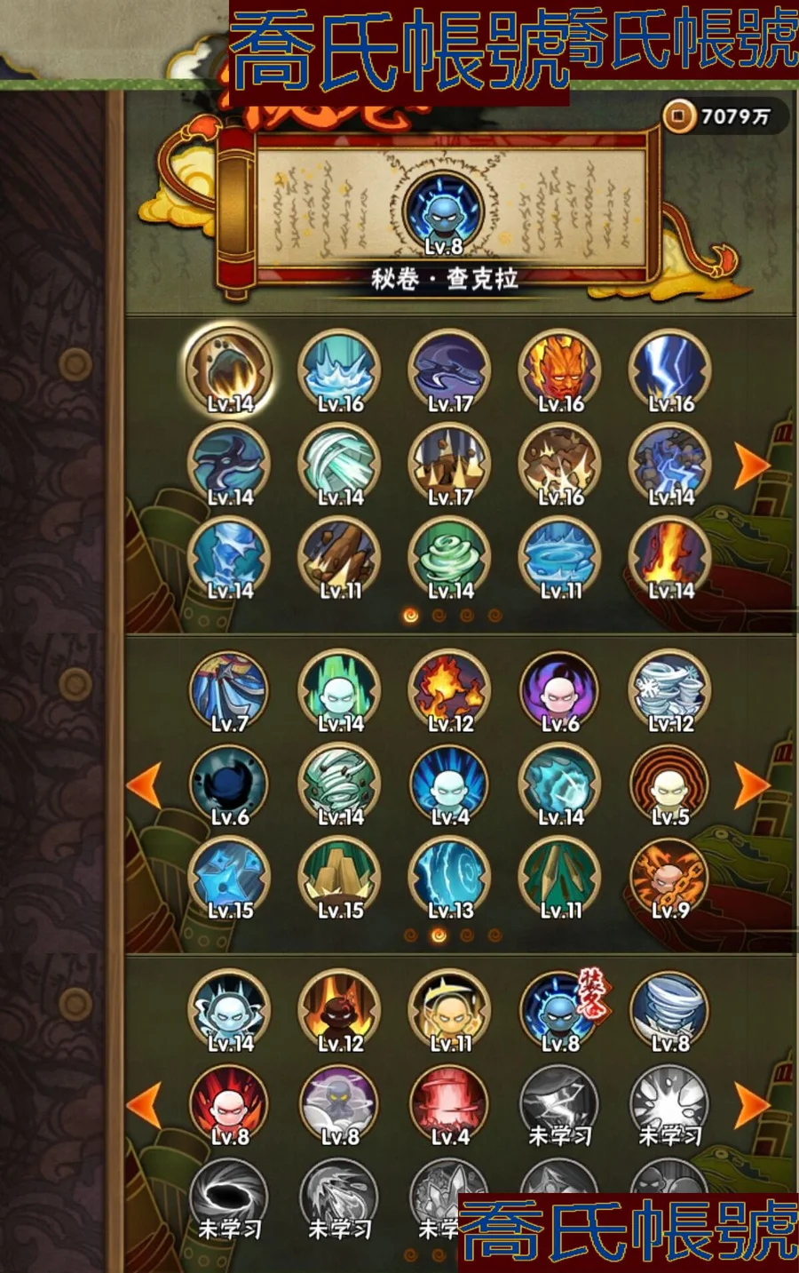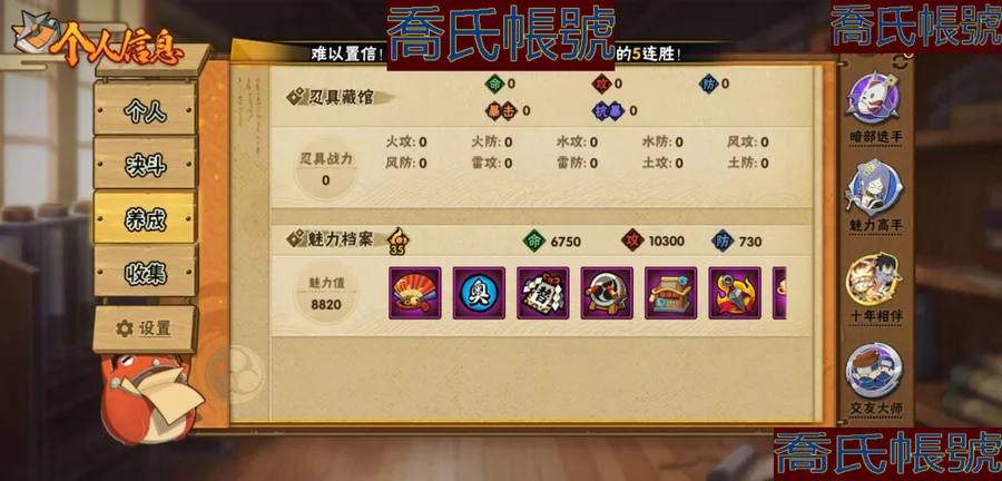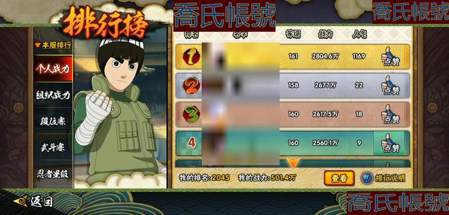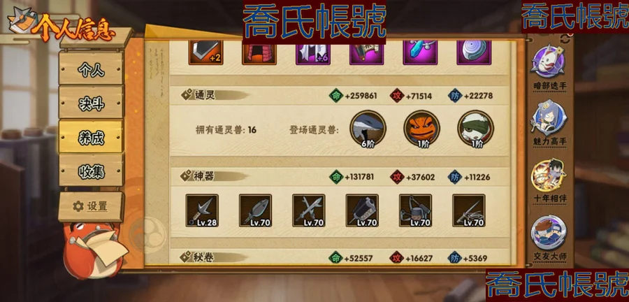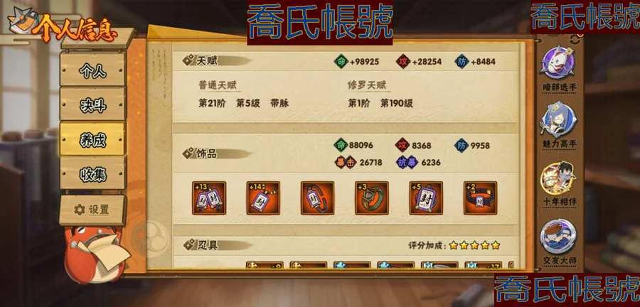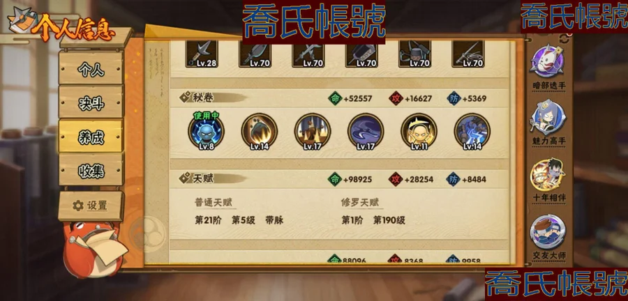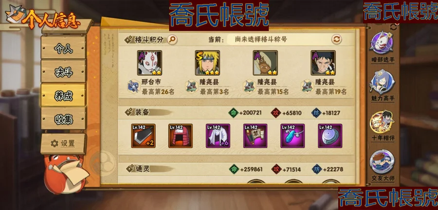 【OBHKAUE872542】S忍7個;A忍27個;時裝12個;通靈獸16個;秘卷31個;戰鬥力:501W+;主場景0個;段位:上忍1階;本服排名:2045;戰區排名:未上榜;VIP7級;S忍:穢土轉生解宇智波斑,忍界大戰宇智波帶土,天道佩恩,漩渦鳴人宇智波佐助,舞之豪傑自來也,波風水門,須佐能乎宇智波鼬;A忍:青春爆炸邁特凱,漂泊浪客宇智波帶土,仙人模式巳月,幻之真容旗木卡卡西,青年長門,忍者之路神秘面具男,近松十人衛千代,曉創生角都,半蛇斗篷藥師兜,須佐能乎宇智波佐助,曉大蛇丸,火影繼承人猿飛日斬,五代目雷影達魯伊,死司憑血飛段,疾風傳我愛羅,飛段,神駒佑將小南,邁特凱,幹柿鬼鮫(4星),蠍,猿飛阿斯瑪(3星),桃式顯現漩渦博人,最終章日向雛田,新春限定大蛇丸,不動,宇智波泉奈,俠隱江湖大野木;通靈獸:忍犬,藍蛇,蛤蟆吉,忍龜,鐮鼬,猿魔,山椒魚,蜃,蛤蟆仙人,鮫鯊,蛤蟆健,砂之守鶴,烏鴉,零尾,蛤蟆龍,豚豚;時裝:宿命連結漩渦鳴人宇智波佐助,蜀面豪傑舞之豪傑自來也,百戰宇智波鼬須佐能乎,百戰佩恩天道,百戰波風水門,太極靈韻日向花火武當宗師,血霧怪人幹柿鬼鮫,龍的傳人李洛克截拳宗師,緋櫻綻放春野櫻百豪,傳說的光芒波風水門,朱霞呈祥神駒佑將小南,熊貓少女天天峨眉宗師;秘卷:土遁·地動,水遁·水龍捲,水遁·水貽拿原,雷遁·雷電擊,火遁·鬼燈籠,火遁·豪炎失,土遁·土柱爆,風遁·真空波,水遁·水衝波,通靈·返手裡劍,土遁·土流槍,雷遁·地走,土遁·巖落,通靈·護手裡劍,風遁·斬空波,通靈·雷光劍化,幻術·此處非之術,木遁·扦插之術,掌仙術·活,風遁·風殺陣,忍體術·反,封印術·四肢重封印,禁術·陰愈傷滅,封印術·除魔,冰遁·燕吹雪,水遁·水盾,木遁·一字連柱,幻術·黑暗行之術,冰遁·凍雪,火遁·裂炎彈,解術·散;詳情看圖【2913】【安卓QQ】【不可二次實名】【官方截圖】黃猿有91片,想玩的話可以肝一下;傳說自來也沒記錯的話有六十多片,還有忍戰寧次也有二十多片,忍戰雷紫狗屎櫻都有點碎片,想玩可以肝一下,v8還有108就上了,還有綠牛有50片。還有號上沒金幣了