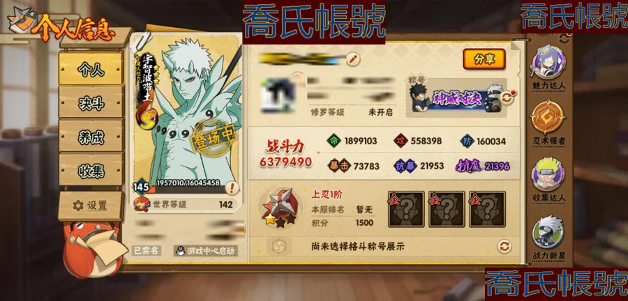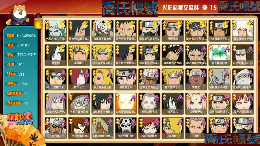 【OBHKAUE902842】S忍14個;A忍44個;時裝16個;通靈獸18個;秘卷31個;戰鬥力:637W+;主場景1個;段位:上忍1階;本服排名:862;戰區排名:未上榜;VIP11級;S忍:十尾人柱力宇智波帶土,穢土轉生解宇智波斑,白面具宇智波斑,忍界大戰宇智波帶土,須佐能乎旗木卡卡西,天道佩恩,漩渦鳴人宇智波佐助,穢土轉生千手柱間,舞之豪傑自來也,大蛇丸,波風水門,穢土轉生波風水門,穢土轉生宇智波斑,須佐能乎宇智波鼬;A忍:青春爆炸邁特凱,漂泊浪客宇智波帶土,仙人模式巳月,忍界大戰日向寧次,猿飛木葉丸,青年長門,穢土轉生迪達拉,宇智波止水,忍界大戰奇拉比,青年波風水門,青年艾,鮫肌融合幹柿鬼鮫,漂泊武士桃地再不斬,近松十人衛千代,半蛇斗篷藥師兜,須佐能乎宇智波佐助,九尾查克拉漩渦鳴人,惡靈之影飛段,曉大蛇丸,百豪春野櫻,忍界大戰秋道丁次,忍界大戰我愛羅,奇拉比,五代目水影照美冥,五代目雷影達魯伊,死司憑血飛段,疾風傳我愛羅(3星),迪達拉,飛段(3星),仙人模式漩渦鳴人,神威對決旗木卡卡西,邁特凱(4星),幹柿鬼鮫(3星),穢土轉生桃地再不斬,蠍(3星),緋流琥蠍,猿飛阿斯瑪(4星),桃式顯現漩渦博人,六代目水影長十郎,不動,宇智波泉奈,羈絆神農,忍界大戰土臺,初始形態機械鳴人;通靈獸:忍犬,藍蛇,蛤蟆吉,忍龜,鐮鼬,猿魔,山椒魚,蜃,蛤蟆仙人,鮫鯊,蛤蟆健,砂之守鶴,烏鴉,蛞蝓,蛤蟆龍,萬蛇,蛤蟆廣,豚豚;時裝:宿命連結漩渦鳴人宇智波佐助,蜀面豪傑舞之豪傑自來也,百戰宇智波鼬須佐能乎,百戰佩恩天道,百戰波風水門,百戰大蛇丸,太極靈韻日向花火武當宗師,血霧怪人幹柿鬼鮫,龍的傳人李洛克截拳宗師,緋櫻綻放春野櫻百豪,驚雷掠影達魯伊五代目雷影,傳說的光芒波風水門,朱霞呈祥神駒佑將小南,編織虛實宇智波鼬,可愛睡衣漩渦鳴人,剎那的藝術迪達拉;秘卷:土遁·地動,水遁·水龍捲,水遁·水貽拿原,雷遁·雷電擊,火遁·鬼燈籠,火遁·豪炎失,土遁·土柱爆,風遁·真空波,水遁·水衝波,通靈·返手裡劍,土遁·土流槍,雷遁·地走,土遁·巖落,通靈·護手裡劍,風遁·斬空波,通靈·雷光劍化,幻術·此處非之術,木遁·扦插之術,掌仙術·活,風遁·風殺陣,忍體術·反,封印術·四肢重封印,禁術·陰愈傷滅,封印術·除魔,冰遁·燕吹雪,水遁·水盾,木遁·一字連柱,幻術·黑暗行之術,冰遁·凍雪,火遁·裂炎彈,解術·散;主場景:博人傳;詳情看圖【1914】【安卓QQ】【不可二次實名】【官方截圖】急需用錢