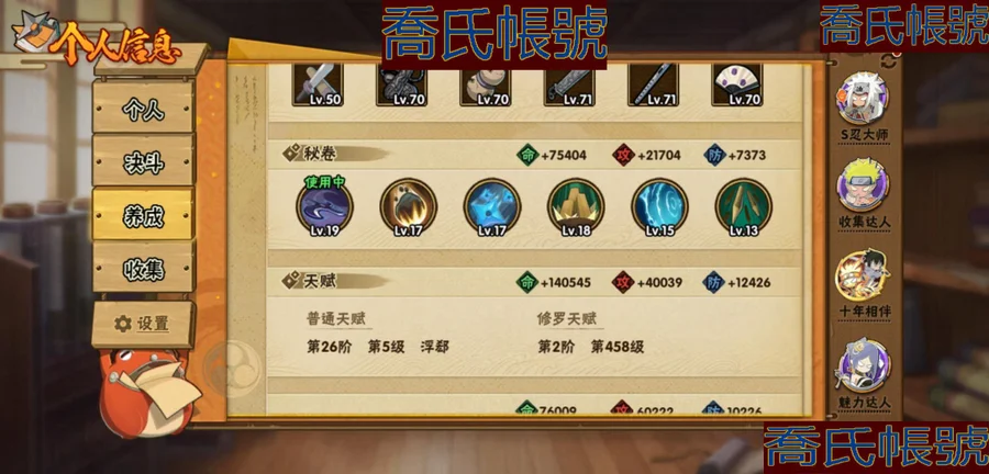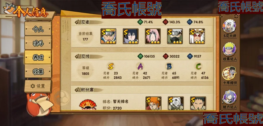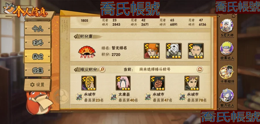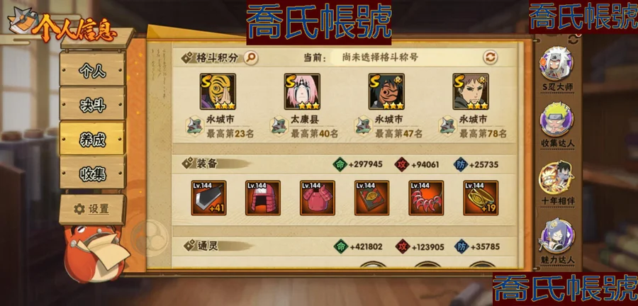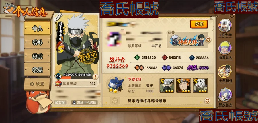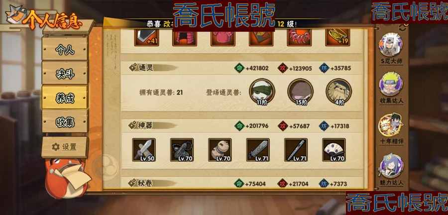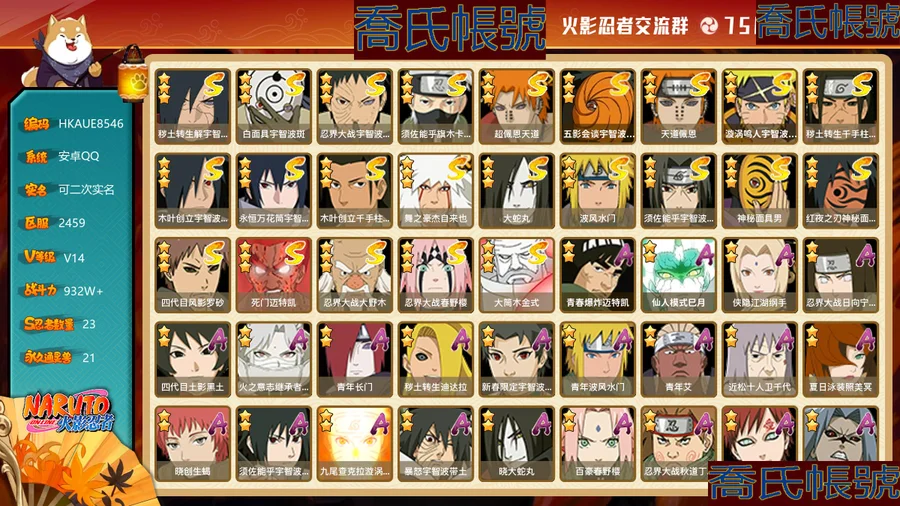 【OBHKAUE854642】S忍23個;A忍42個;時裝16個;通靈獸21個;秘卷31個;戰鬥力:932W+;主場景1個;段位:下忍2階;本服排名:560;戰區排名:未上榜;VIP14級;S忍:穢土轉生解宇智波斑,白面具宇智波斑,忍界大戰宇智波帶土,須佐能乎旗木卡卡西,超佩恩天道,五影會談宇智波斑,天道佩恩,漩渦鳴人宇智波佐助,穢土轉生千手柱間,木葉創立宇智波斑,永恆萬花筒宇智波佐助,木葉創立千手柱間,舞之豪傑自來也,大蛇丸,波風水門,須佐能乎宇智波鼬,神秘面具男,紅夜之刃神秘面具男,四代目風影羅砂,死門邁特凱,忍界大戰大野木,忍界大戰春野櫻,大筒木金式;A忍:青春爆炸邁特凱,仙人模式巳月,俠隱江湖綱手,忍界大戰日向寧次,四代目土影黑土,火之意志繼承者卑留呼,青年長門,穢土轉生迪達拉,新春限定宇智波止水,青年波風水門,青年艾,近松十人衛千代,夏日泳裝照美冥,曉創生蠍,須佐能乎宇智波佐助,九尾查克拉漩渦鳴人,暴怒宇智波帶土,曉大蛇丸,百豪春野櫻,忍界大戰秋道丁次,忍界大戰我愛羅,疾風傳咒印宇智波佐助,新春限定宇智波鼬,萬花筒寫輪眼宇智波佐助,五代目水影照美冥,死司憑血飛段,疾風傳我愛羅(4星),迪達拉,飛段(3星),神駒佑將小南,仙人模式漩渦鳴人,旗木卡卡西,邁特凱(3星),宇智波鼬,夏日限定宇智波鼬,幹柿鬼鮫(3星),蠍(3星),緋流琥蠍,猿飛阿斯瑪(3星),六代目水影長十郎,宇智波泉奈,初始形態機械鳴人;通靈獸:忍犬,藍蛇,砂之守鶴,蛤蟆吉,忍龜,鐮鼬,猿魔,山椒魚,蜃,蛤蟆仙人,鮫鯊,蛤蟆健,烏鴉,蛞蝓,萬蛇,蛞蝓俠隱江湖,熊貓,蛤蟆龍,威裝須佐十週年,豚豚,蛤蟆廣;時裝:蜀面豪傑舞之豪傑自來也,百戰大蛇丸,宿命連結漩渦鳴人宇智波佐助,百戰波風水門,百戰宇智波鼬須佐能乎,百戰佩恩天道,水之妖姬照美冥五代目水影,緋櫻綻放春野櫻百豪,剎那的藝術迪達拉,烈土霓裳黑土四代目土影,傳說的光芒波風水門,血霧怪人幹柿鬼鮫,編織虛實宇智波鼬,憤怒的伊始宇智波帶土暴怒,熊貓少女天天峨眉宗師,龍的傳人李洛克截拳宗師;秘卷:風遁·真空波,土遁·地動,土遁·土柱爆,土遁·巖落,水遁·水貽拿原,通靈·護手裡劍,風遁·斬空波,雷遁·地走,通靈·返手裡劍,水遁·水龍捲,火遁·鬼燈籠,水遁·水衝波,火遁·豪炎失,土遁·土流槍,雷遁·雷電擊,木遁·扦插之術,幻術·黑暗行之術,封印術·四肢重封印,忍體術·反,冰遁·凍雪,冰遁·燕吹雪,木遁·一字連柱,掌仙術·活,幻術·此處非之術,通靈·雷光劍化,禁術·陰愈傷滅,解術·散,火遁·裂炎彈,封印術·除魔,水遁·水盾,風遁·風殺陣;主場景:博人傳;詳情看圖【2459】【安卓QQ】【可二次實名】【官方截圖】戰力、vip:933W,V14 碎片: 九尾鳴人61片 九尾水門45片 十尾帶土差20片 二代水影36片 通靈: 熊貓 蛞蝓