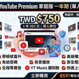 本店另有販售個人版 YouTube Premium ! 價格僅需 ﹩750