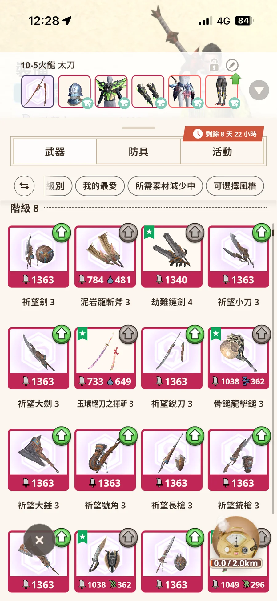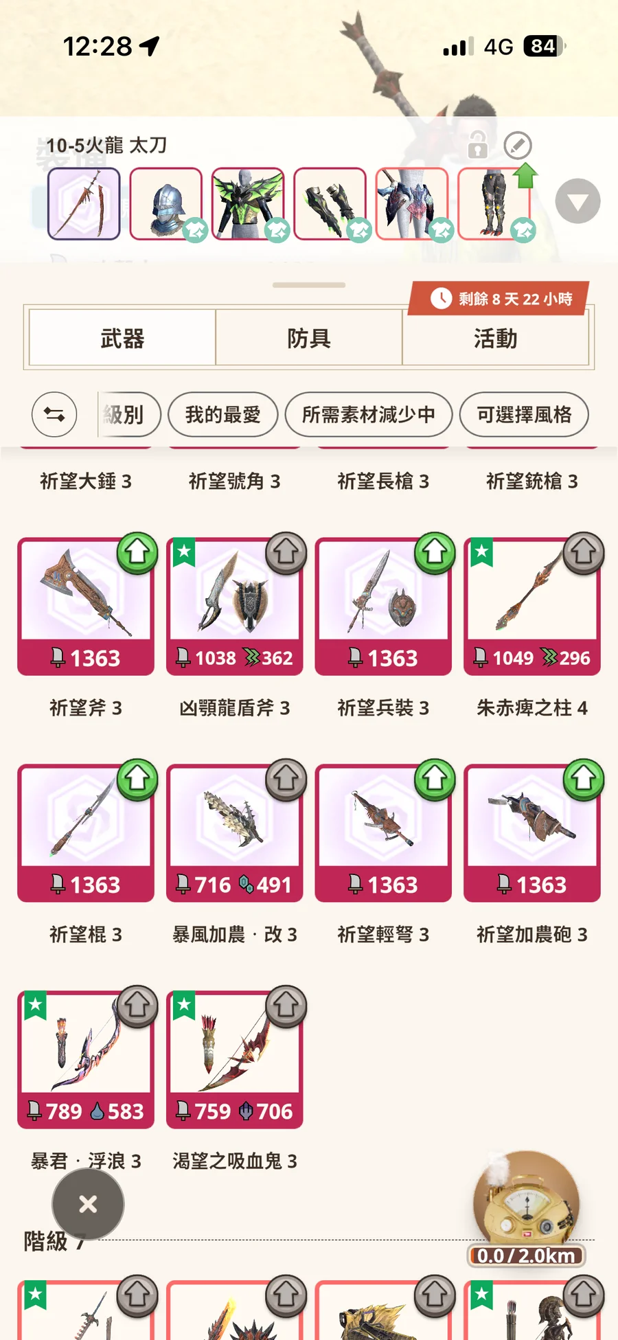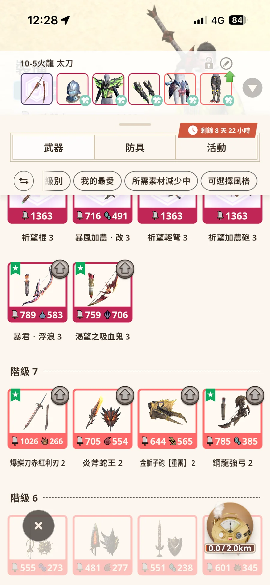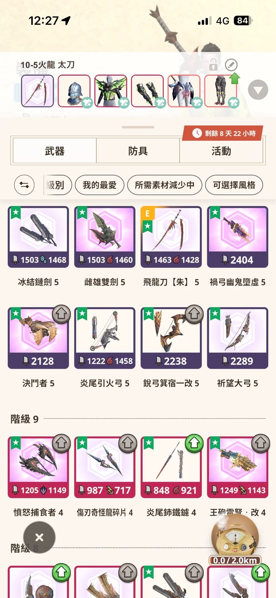 10-5 風漂雙刀、火龍太刀、怨虎輕弩(墊步射)、炎尾弓、希望弓、火龍雙刀(螺旋斬)