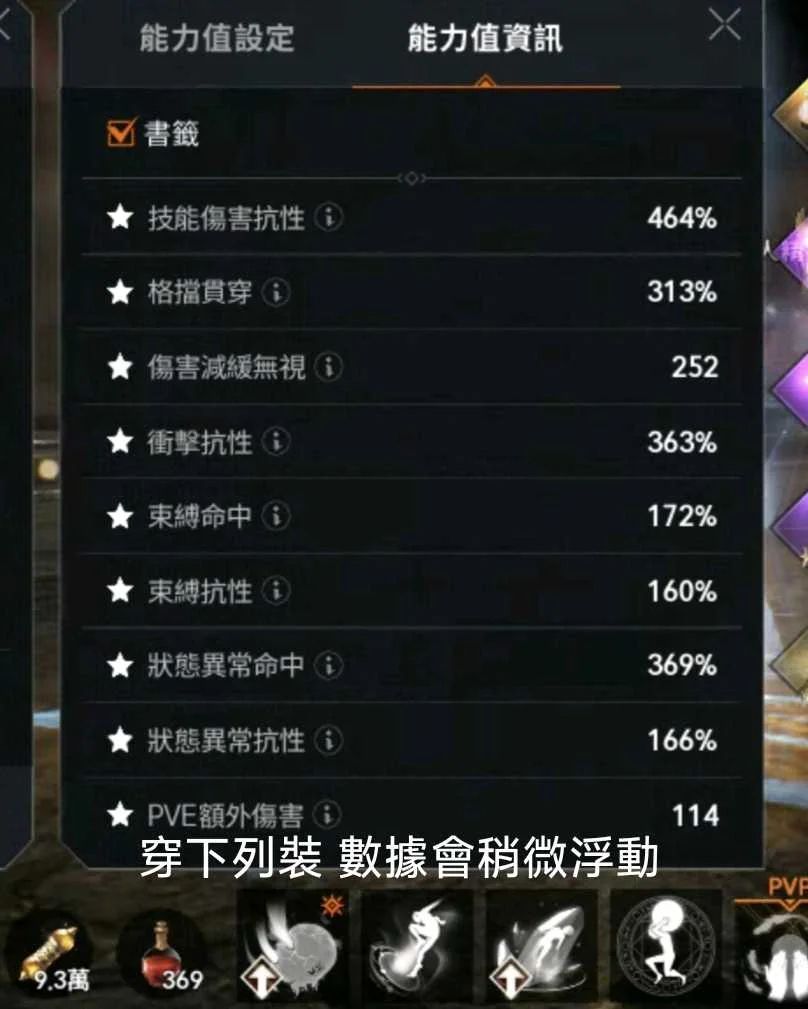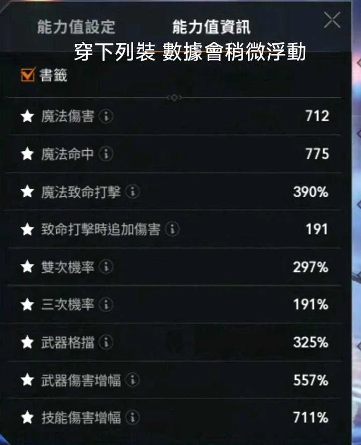 傷害711/命中763/技傷714/衝抗368(穿下列裝,取換裝最大值)