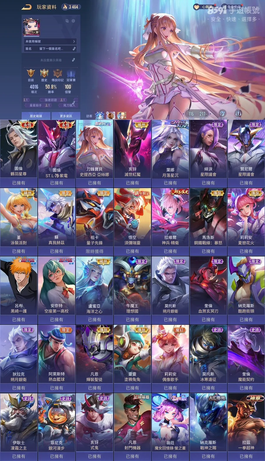 多課金抽獎造型!近全英雄兩百多造型!共116英雄217造型!勝率近51%!!共4次S傳說印記!!常用奧義皆已升滿!!