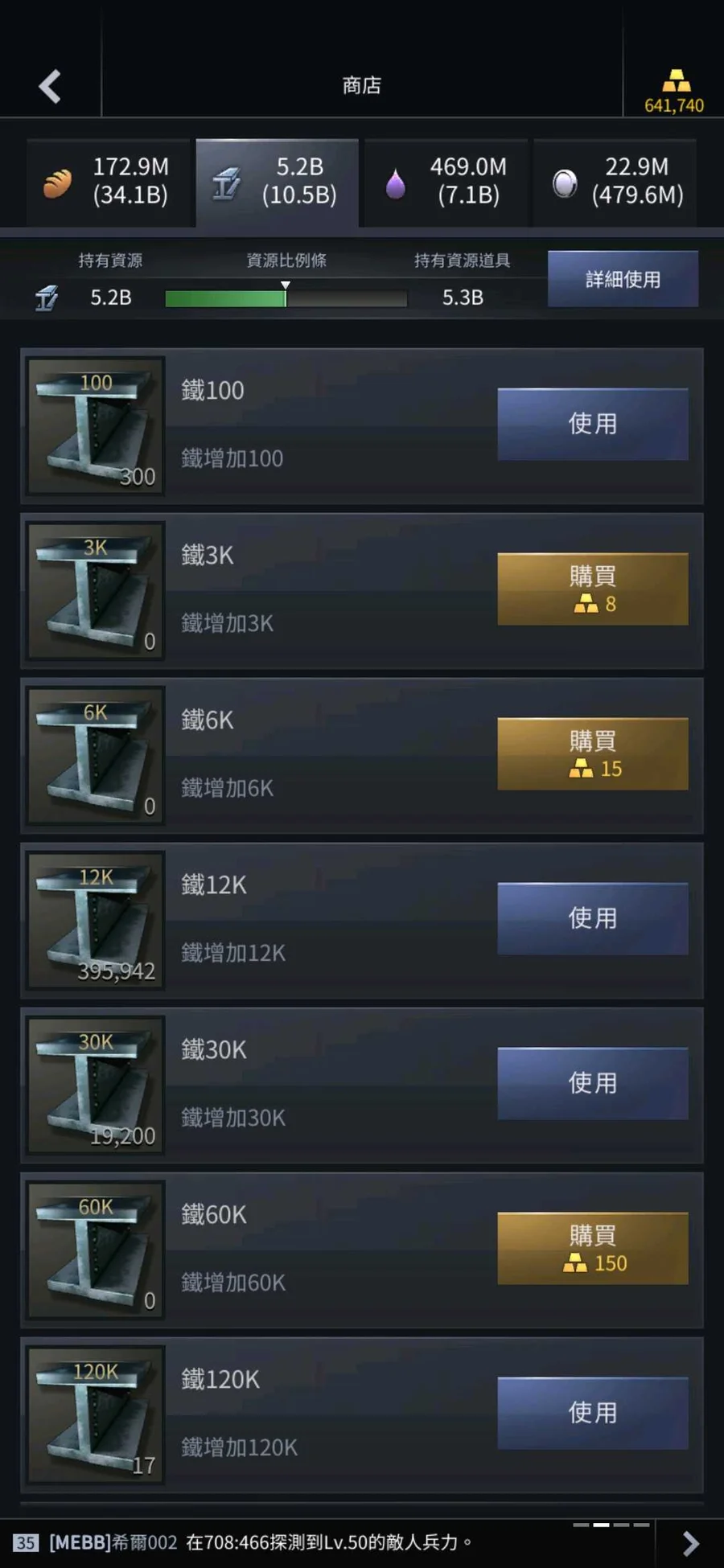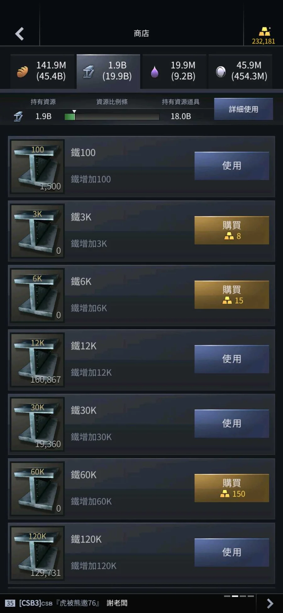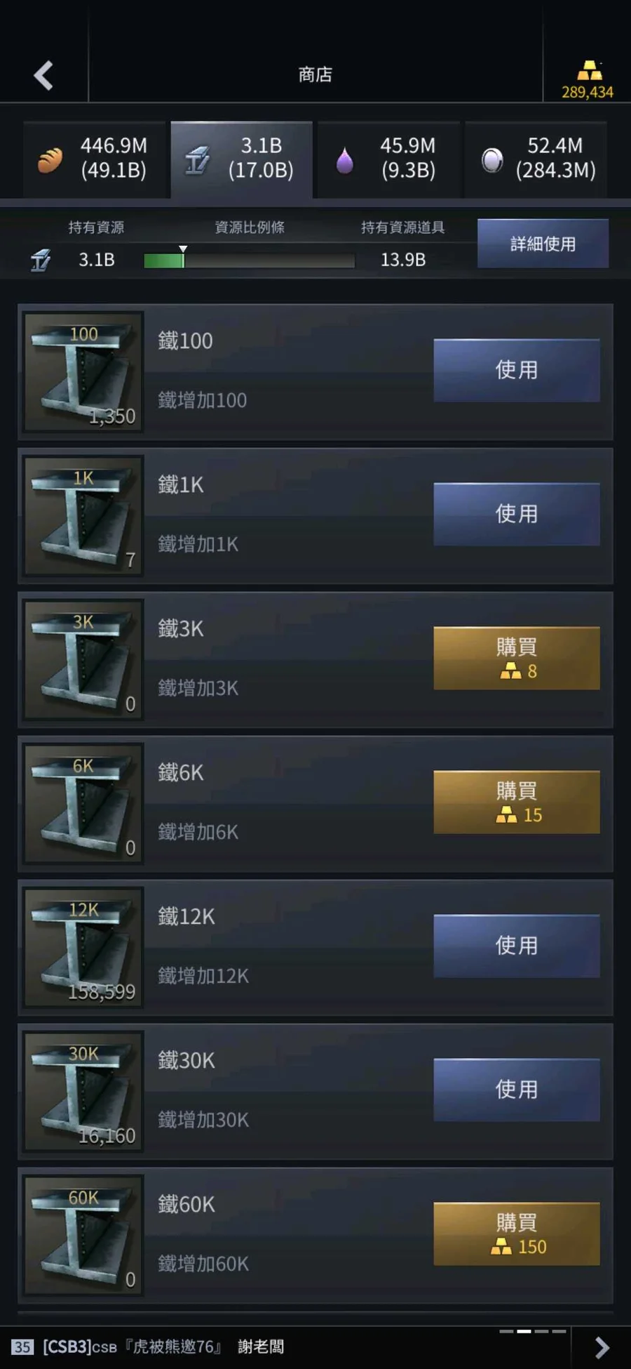 一隻號五個角色各有豐富的鐵資源累積超過40b,其他資源請看圖片!