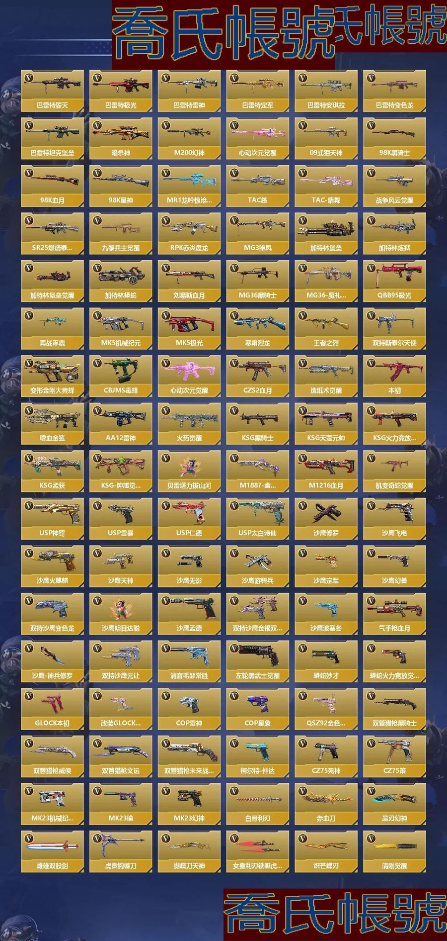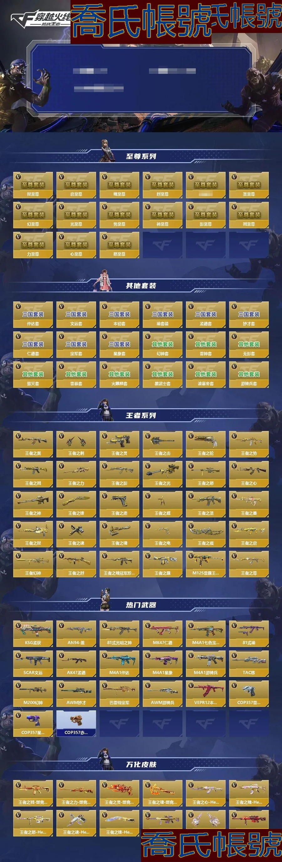 【OBCRVZT948242】VIP10級,255英雄武器,24萬化,17角色;至尊套:翼至尊,光至尊,戮至尊,力至尊,影至尊,心至尊,怒至尊,勢至尊,啟至尊,魄至尊,烈至尊,獄至尊,聖至尊,幻至尊,神至尊;王者武器:王者之翼,王者之勢,王者之戮,王者之力,王者之影,王者之光,王者之怒,王者之心,王者之神,王者之蝶,王者之聖,王者之獸,王者之獄,王者之啟,王者幻神,王者之烈,王者之魄-冠軍珍藏,王者之霆,M12S-雷霆王者,王者之尊,王者之靈,王者之輪,王者之跡,王者之魂,王者之電,王者之刺,王者之擊,王者之鋒,王者之嘯,王者之痕;三國武器:KSG-孟獲,AN94-蓋,MK47-仁德,81式-瑜,SCAR-文遠,AK47-孟德,M4A1-仲達,M4A1-星象,TAC-慈,AWM-妙才,巴雷特-定軍,VEPR12-本初,M4A1-臥龍覺醒,加特林-煉獄,COP357-星象,USP-仁德,沙鷹-定軍,沙鷹-孟德,雙持沙鷹-元讓,消音毛瑟-常勝,蟒蛇-妙才,雙持GLOCK18-本初,雙管獵槍-威侯,雙管獵槍-文遠,柯爾特-仲達,CZ75-策,MK23-瑜,赤血刀,雌雄雙股劍,虎賁鉤鐮刀,尼泊爾-星象,窮奇鐵扇,虎頭湛金槍,龍膽亮銀槍,公瑾佩劍,方天畫戟,鐵鍬-孟德,虛空之槌-妙才;熱門武器:M200-幻神,AWM-遊騎兵,AWM-天龍,AWM-裁決,AWM-天使,巴雷特-毀滅,巴雷特-極光,巴雷特-雷神,巴雷特-安琪拉,巴雷特-變色龍,M200-心動次元覺醒,09式狙-天神,98K-黑騎士,98K-血月,98K-星神,MR1-龍吟驚滄海,TAC-晴舞,GM6-戰爭風雲覺醒,SR25-燃燒泰坦,VSK-94-九黎兵主覺醒,81式-光明之神,M4A1-七色寶葫,M4A1-遊騎兵,AK47-無影,AK47-火麒麟,AK47-黑武士覺醒,AK47-沙漠領主,AK47-耀金伯爵,AK47-冰魂覺醒,AK47-競技戰魂,AK47-機械迷城,AK47-變色龍,AK47-幸運日覺醒,AK47-心動次元覺醒,AK47-雷暴,AK47-血武士,AK47-波塞冬,AK47-華夏傳說,AK47-黑鯊,AK47-木蘭,M4A1-雷神,M4A1-黑騎士,M4A1-黑龍,M4A1-沙漠領主,M4A1-君威GS,M4A1-櫻龍·超覺,M4A1-Rush-夜襲,M4A1-變色龍,M4A1-機械迷城,M4A1-賽博雷神,M4A1-海騎士,M4A1-破空冰刃,M4A1-墮天神,M4A1-心動次元覺醒,M4A1-太白詩仙,SCARLight-白虎,SCAR-探星者,SCAR-心動PICK,AN94-超新星,AN94-捲簾大將軍,AN94-四凶覺醒,AN94-赳赳秦師,9A91-死神,M14EBR-暗夜覺醒,M14EBR-玄武,M16-惡魔,AK12-天啟,QBZ03-金色薔薇,QBZ03-玉面羞花,HK417-炎龍鎧甲,QBZ19-天使,G36-機械紀元,G36-李星雲,G3A3-五色琉璃覺醒,QBZ191-封神榜,MG3-雛鳳,劉易斯-血月,MG36-黑騎士,MG36-魔禮青,QBB95-極光,QBB95-再戰涿鹿,MK5-機械紀元,MK5-極光,雙持斯泰爾-天使,QCW05-變形金剛·大黃蜂,CZS2-心動次元覺醒,CZS2-血月,PP19野牛-造紙術覺醒,AA12-雷神,AA12-火藥覺醒,KSG-黑騎士,KSG-天蓬元帥,KSG-火力競放覺醒,KSG-鍾馗覺醒,貝雷塔-力拔山河,M1887-幽冥玄喵覺醒,M1216-血月,Origin12-機變奇蛇覺醒,COP357-雷神,USP-神罰,USP-雷暴,USP-太白詩仙,沙鷹-修羅,沙鷹-飛電,沙鷹-火麒麟,沙鷹-天神,沙鷹-無影,沙鷹-遊騎兵,沙鷹-幻獸,雙持沙鷹-變色龍,沙鷹-明目達聰,雙持沙鷹-金銀雙煞,沙鷹-波塞冬,氣手槍-血月,沙鷹-神兵修羅,左輪-黑武士覺醒,蟒蛇-火力競放覺醒,改裝GLOCK-櫻龍·超覺,QSZ92-金色薔薇,雙管獵槍-黑騎士,雙管獵槍-未來戰士,CZ75-死神,MK23-機械紀元,MK23-幻神,白骨利刃,墨刃-幻神,蝴蝶刀-天神,女皇利刃-鐵膽虎魄,熾芒蝶刃,清剛-覺醒,龍嘯,神罰戰斧,戰斧-無影,血陽,屠龍,尼泊爾-火麒麟,尼泊爾-機械紀元,尼泊爾-競界榮光,太白詩仙扇,麒麟刺,黑龍刺,馬來劍-毀滅,斬魔劍-天使,擎天覺醒,鐵鍬-遊騎兵,雷霆,三叉戟-波塞冬,叢林匕首-死神,叢林匕首-火力競放覺醒,叢林匕首-慶龍覺醒,斬神刀,斬神刀-雷暴,末日裁決覺醒,馬來劍-耀金伯爵,王者之蝶,AK47-火麒麟-靈狐,AK47-無影-葵,AWM-天龍-曼陀羅,奪魂,迷你玉凝;生化武器:王者之蝶,王者之獄,王者之烈,VEPR12-本初,M4A1-死神,加特林-煉獄,加特林-蟒蛇,CBJ-MS-毒蜂,嗜血金鯊;挑戰武器:巴雷特-坦克堡壘,暗殺神,RPK-赤炎盤龍,加特林-堡壘,加特林-堡壘覺醒,寒霜烈龍;角色:零,葵,龍野,孤狼,櫻,關小雨,蝴蝶,雲悠悠,王者零,雨墨,霧萌萌,晴雅,嵐兮兒,職場靈狐賽事經理,雅典娜,刀鋒-槍戰王者,熾天使X;武器皮膚:王者之魂-HeartShot,王者之光-HeartShot,王者之心-HeartShot,王者之刺-HeartShot,王者之鋒-HeartShot,王者之魄-HeartShot,王者之怒-HeartShot,王者之靈-燃競之巔,王者之嘯-燃競之巔,王者之戮-燃競之巔,王者之力-燃競之巔,M4A1-星象-璀璨星辰·玄武,M4A1-星象-璀璨星辰·白虎,M4A1-星象-璀璨星辰·朱雀,M4A1-星象-璀璨星辰·青龍,巴雷特-定軍-忿魔,AWM-妙才-過載,SCAR-文遠-過載,81式-瑜-龍騰之力,AK47-孟德-過載,M4A1-仲達-過載,M4A1-仲達-烽火連城,M200-幻神-戰舞,M4A1-七色寶葫-黑曜;詳情看圖【蘋果QQ】【可二次實名】【自主截圖】槍皇-19英雄角色數-366英雄武器數 【王者系列】:王者之翼,王者之刺,王者之靈,王者之擊,王者之輪,王者之勢,王者之戮*2,王者之力,王者之影*2,王者之光,王者之怒,王者之心,王者之神,王者之鋒,王者之跡,王者之蝶,王者之聖,王者之獸,王者之獄,王者之魂,王者之嘯*2,王者之電*3,王者之痕,王者之啟,王者幻神,王者之烈,王者之魄-冠軍珍藏,王者之霆,M12S-雷霆王者,王者之尊 【熱門
