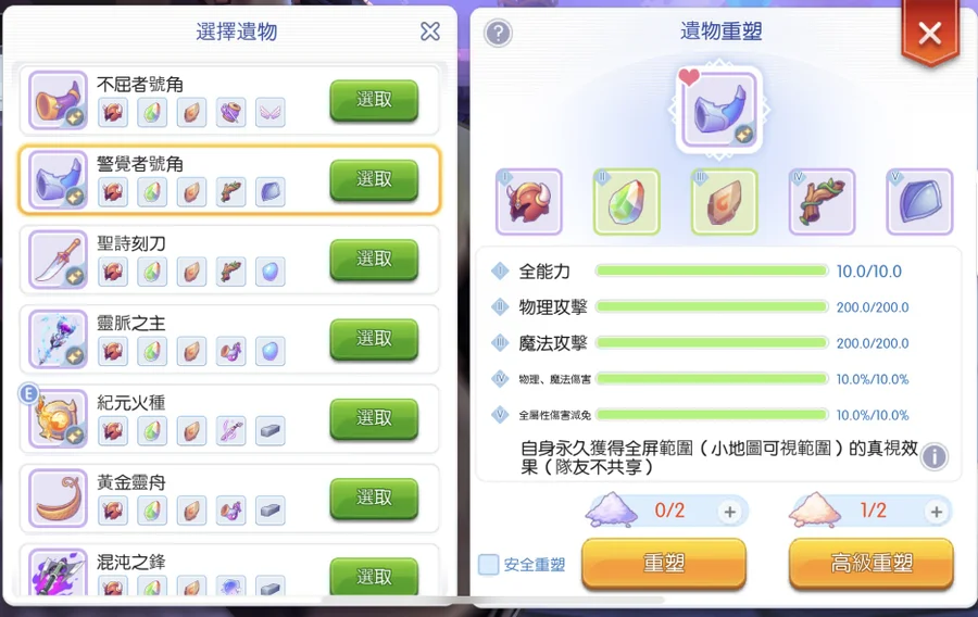 遺物:真視 血保 防轉 火種 靈脈 (異常、命中皆點亮,都75%左右快點滿)