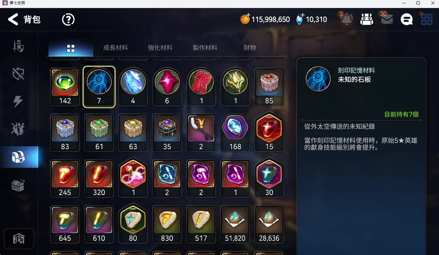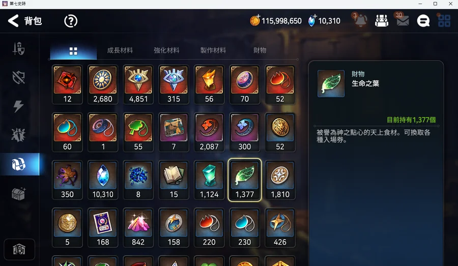 葉子1377片、紅葉2百24萬、神秘2087、人蔘472、石板7片、知識粉末842、1W鑽石