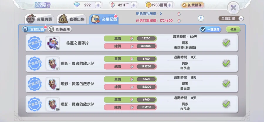 交易還有170萬水晶未領
