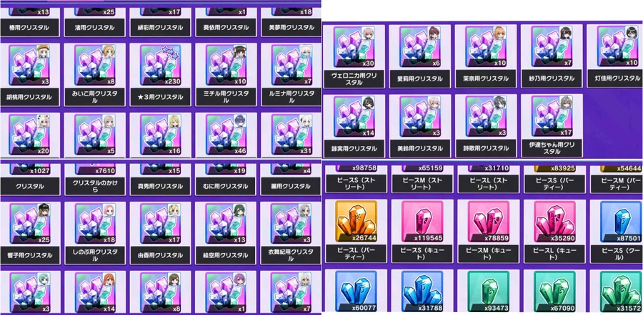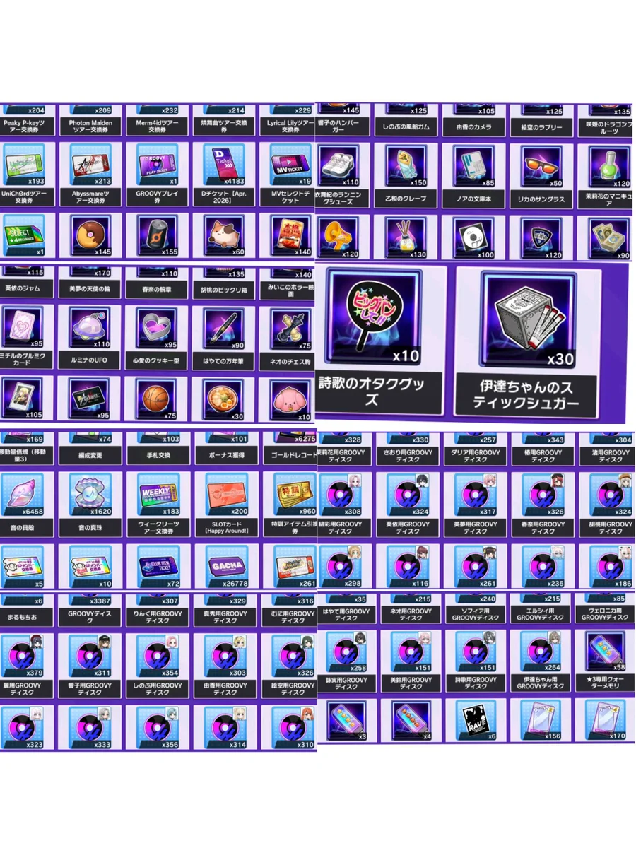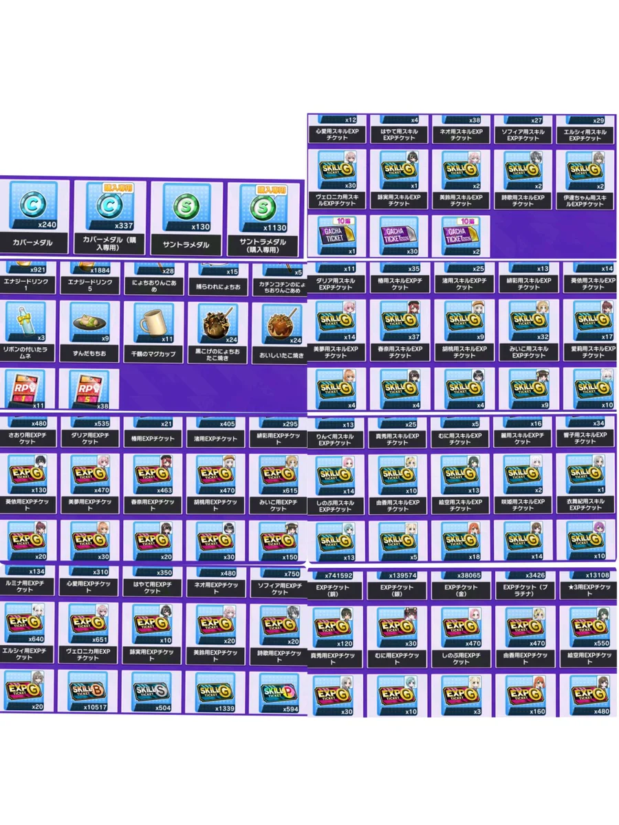 鑽石64萬多顆,可以抽3000鑽石十連抽214次;ツアー交換券有上千張,可以換很多資源;特訓アイテム引換券有960張,可以換全種類的特訓升級必需品;等級&技能升級經驗也是有很多;有一些道具會隨著我持續練帳號有所改變,但鑽石會持續增加,增加這個帳號的價值哦!(總量在2026/04/19 更新)