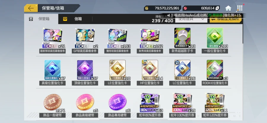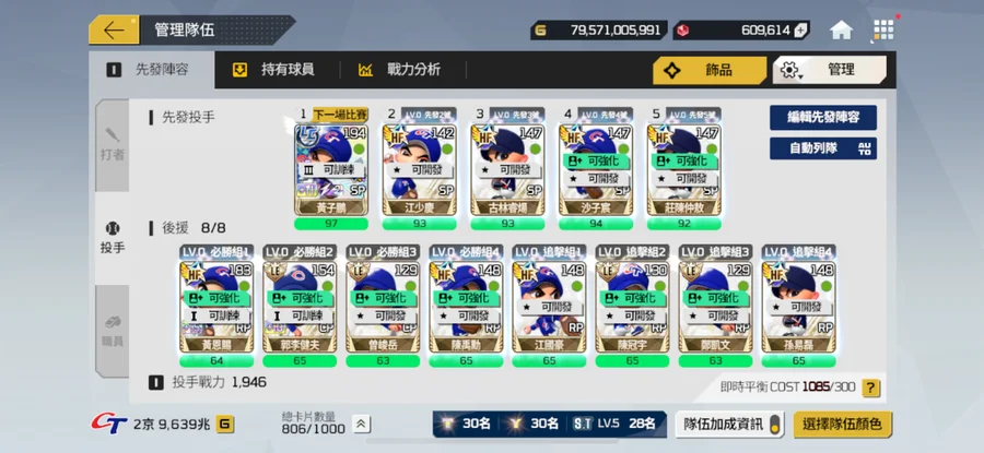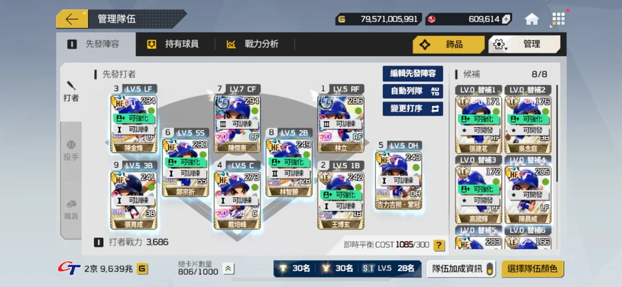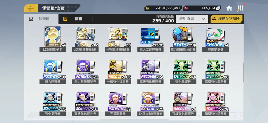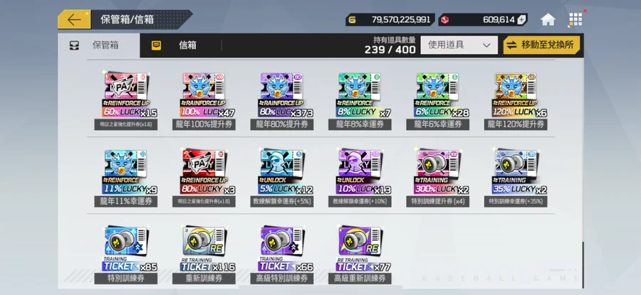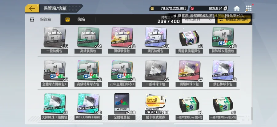 一手乾淨帳號綁定乾淨G帳號最受喜愛的中華隊。五周年裝備組,棒球卡全+5,一堆強化卷,抽獎卷。