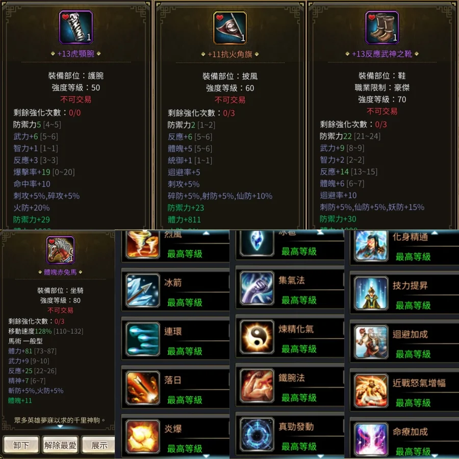 裝備 : +12黑斗笠.+13英雄鎧.+13馬甲.+13虎顎腕.+13武神鞋.128跑強3赤兔馬