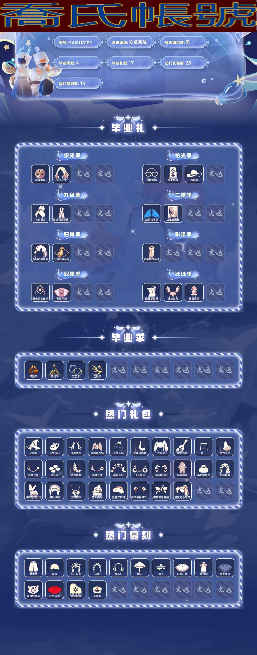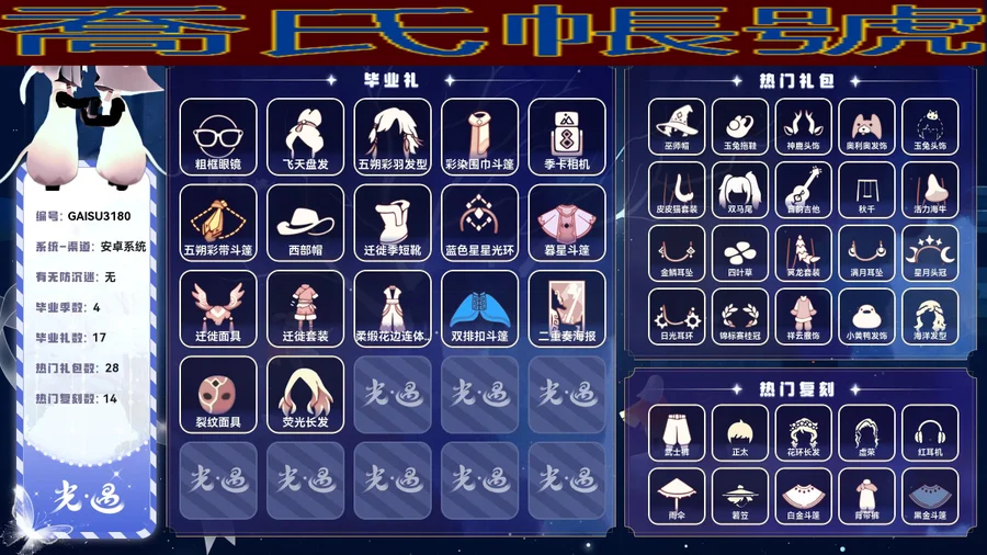 【OBGAISU318042】蠟燭189,愛心130,光翼183,畢業季:雙星季,歸巢季,拾光季,遷徙季;畢業禮:粗框眼鏡,飛天盤發,五朔彩羽髮型,彩染圍巾斗篷,季卡相機,五朔綵帶斗篷,西部帽,遷徙季短靴,藍色星星光環,暮星斗篷,遷徙面具,遷徙套裝,柔緞花邊連體褲,雙排扣斗篷,二重奏海報,裂紋面具,熒光長髮;禮包:巫師帽,玉兔拖鞋,神鹿頭飾,奧利奧髮飾,玉兔頭飾,皮皮貓套裝,雙馬尾,音韻吉他,鞦韆,活力海牛,金鱗耳墜,四葉草,冥龍套裝,滿月耳墜,星月頭冠,日光耳環,錦標賽桂冠,祥雲服飾,小黃鴨髮飾,海洋髮型,蝴蝶與花髮飾,多彩絨帽,優雅領巾,雪人頭飾,藍色守護帽,綠絨絨卷耳髮飾,綴黃畫筆髮箍,寶駿丹心馬尾;熱門復刻:武士褲,正太,花環長髮,虛榮,紅耳機,雨傘,箬笠,白金斗篷,背帶褲,黑金斗篷,黃鼠狼面具,紅金斗篷,高音鋼琴,平頂帽;【郵箱登入】【安卓系統】【官服】【無防沉迷】【官方截圖】