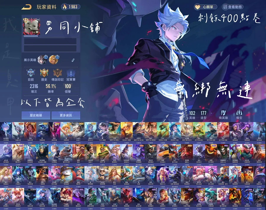 【Garena帳無綁無連、先鋒傳說·光影、V8、102英、177造】無無好綁定 那刻次元 蘇惡魔製造 15000不實 可以談看看 內涵四百點